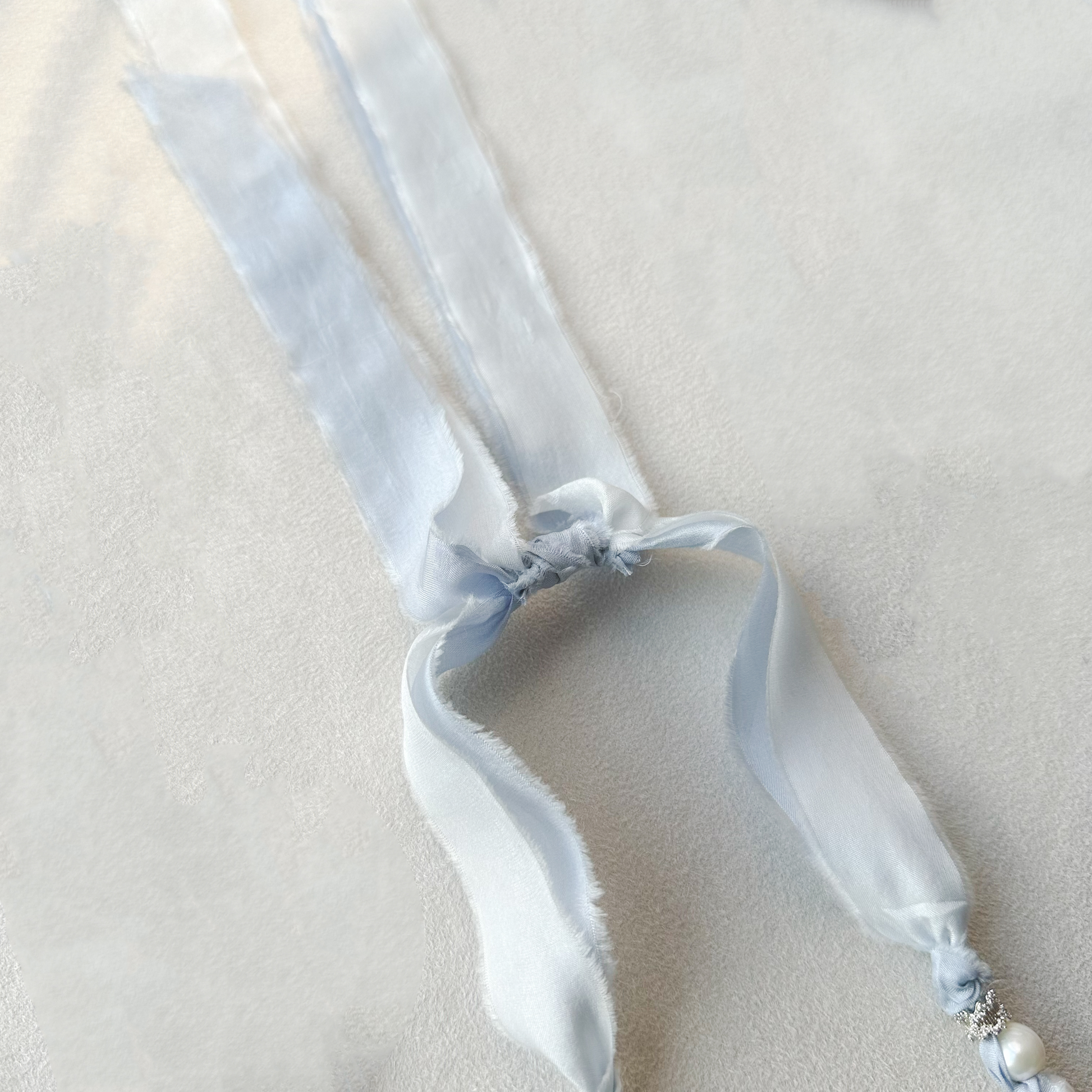 - Materials: Freshwater pearls; raw, hand-torn habotai silk ribbon; silver plated cz components