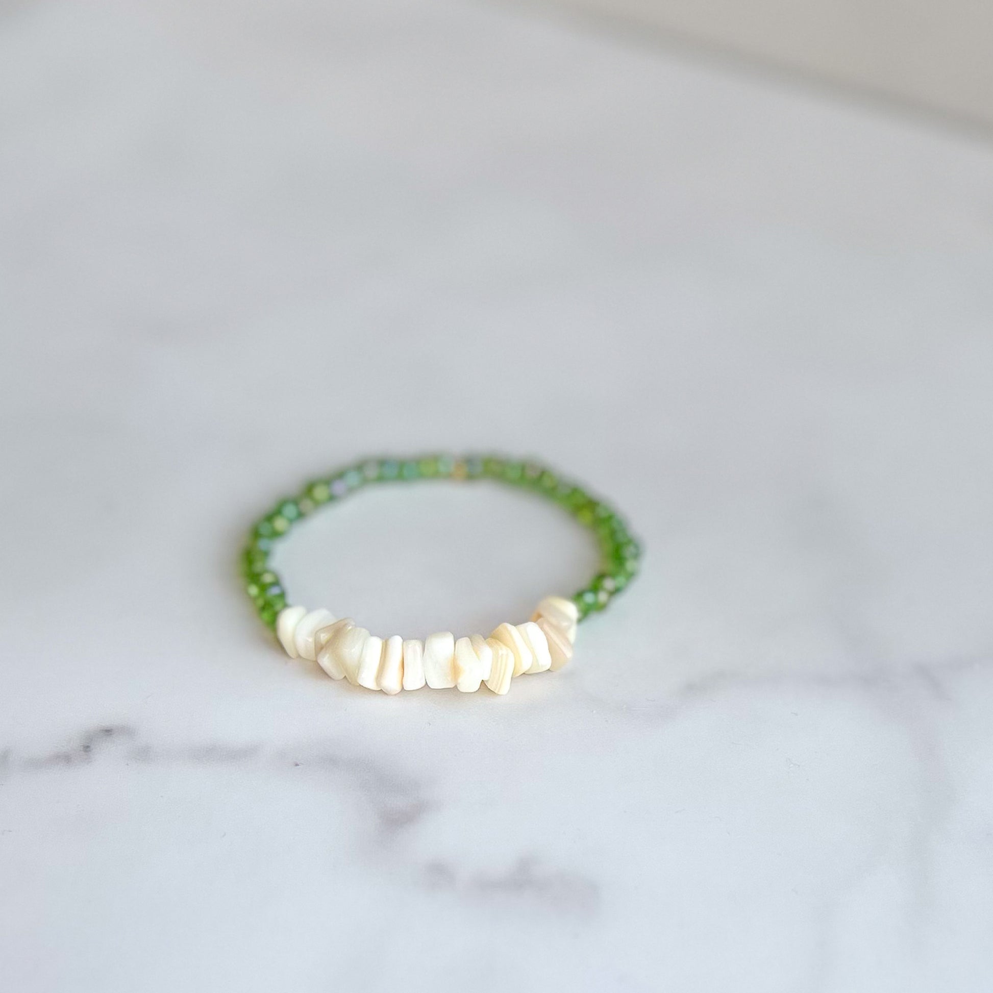 - Handmade glass seed beaded stretch bracelet, accented with a band of natural shell chips