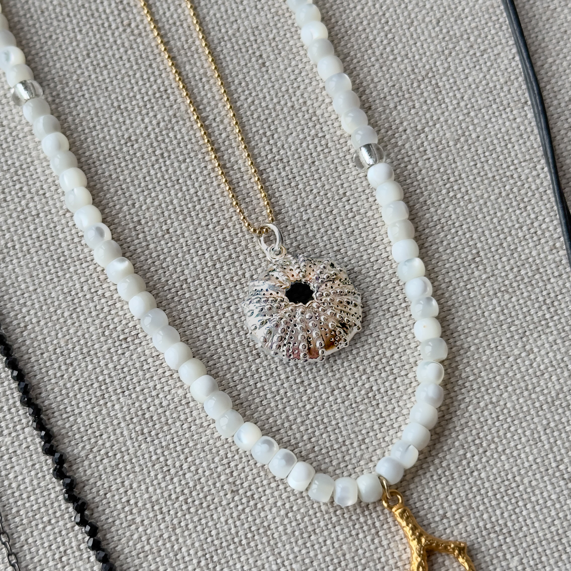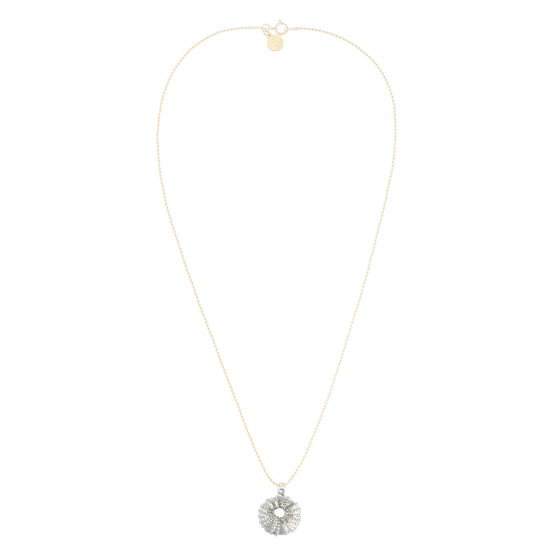 - Materials: White gold plated sterling silver sea urchin charm, gold filled ball chain, gold plated component