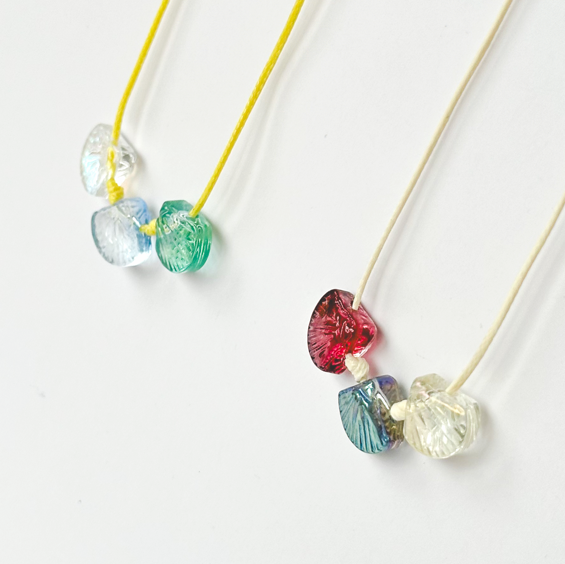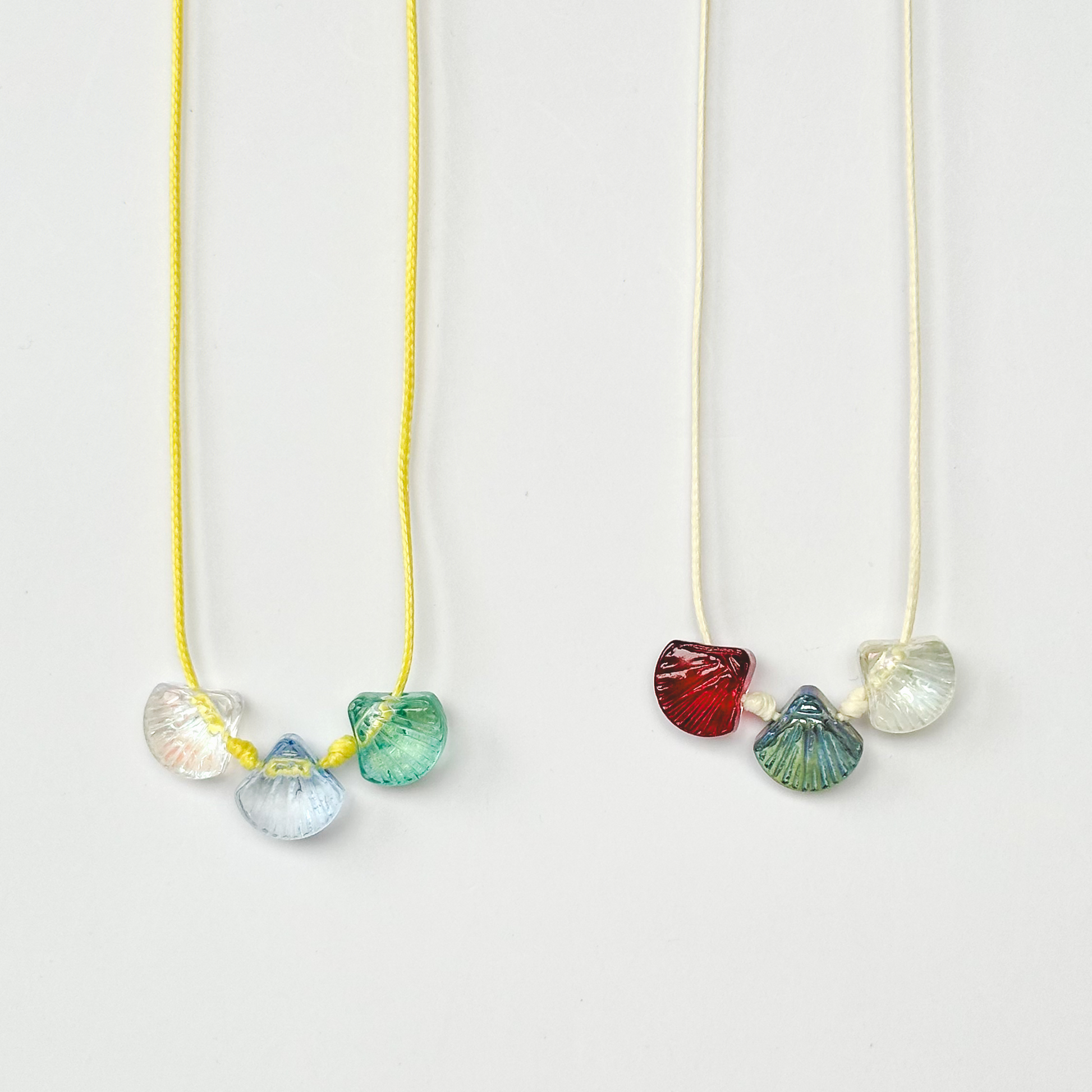 - Materials: A trio of ombre Czech glass scallop sea shell charms, waxed polyester cord, glass seed beads