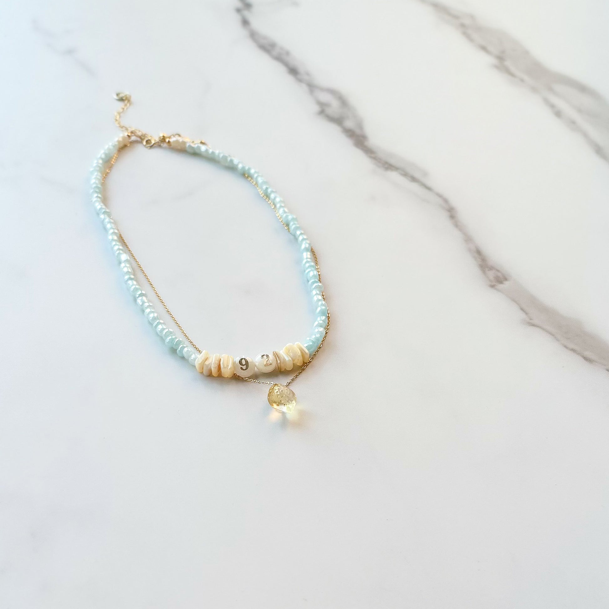 - A duo of gold-filled cable chain and glass seed beaded necklaces decorated with a lemon charm, natural shell chips and the option to add a series of mother of pearl number beads, representing your life path number, to the "Kailani" style (please indicate the number in the "special instructions" section of shopping cart):