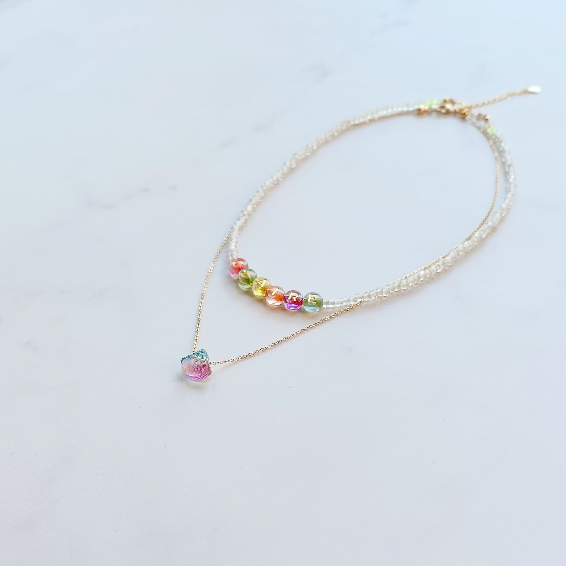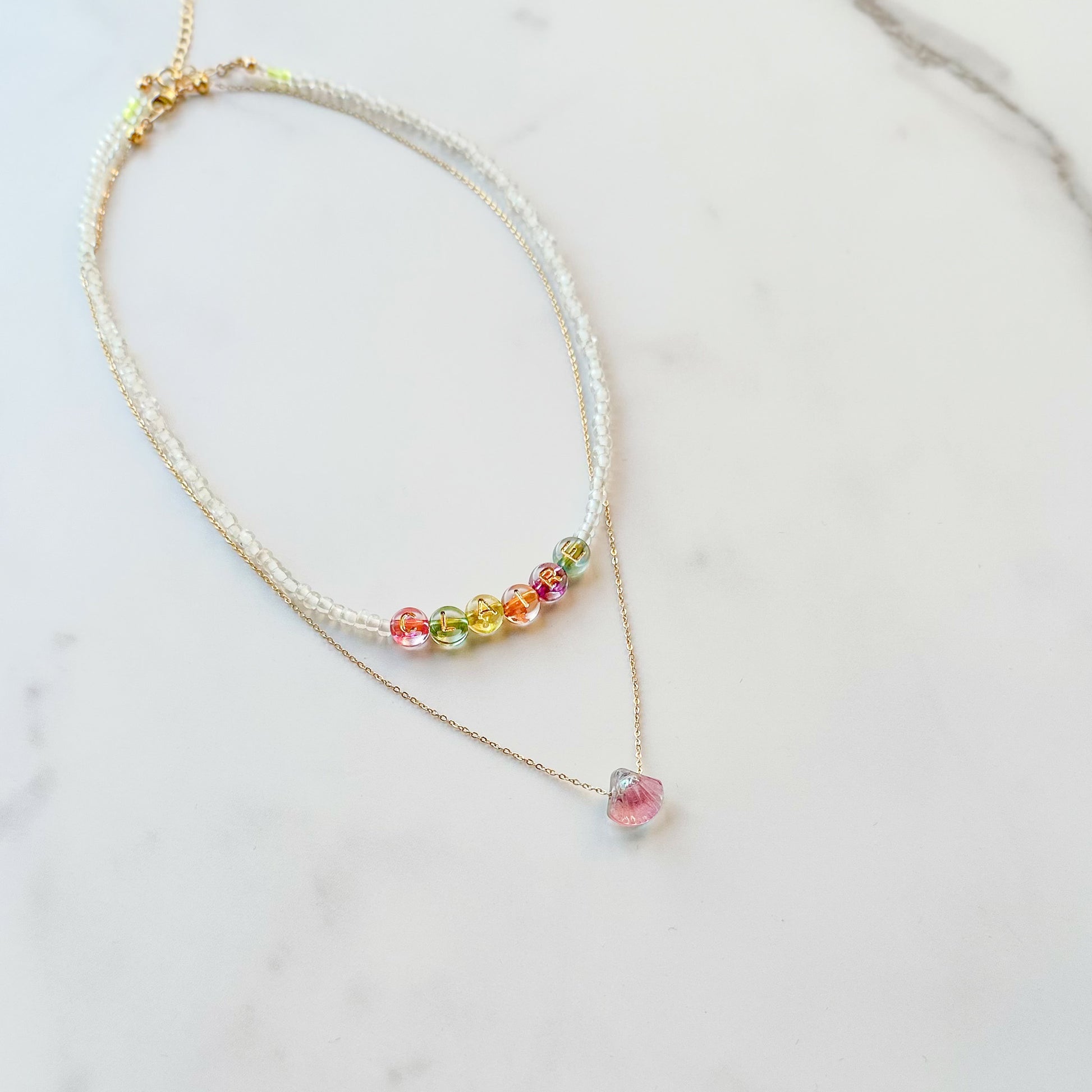 - A duo of gold-filled cable chain and glass seed beaded necklaces decorated with a shell charm and colorful letter beads to personalize with your name for the "Neri" style (please indicate the name in the "special instructions" section of shopping cart):