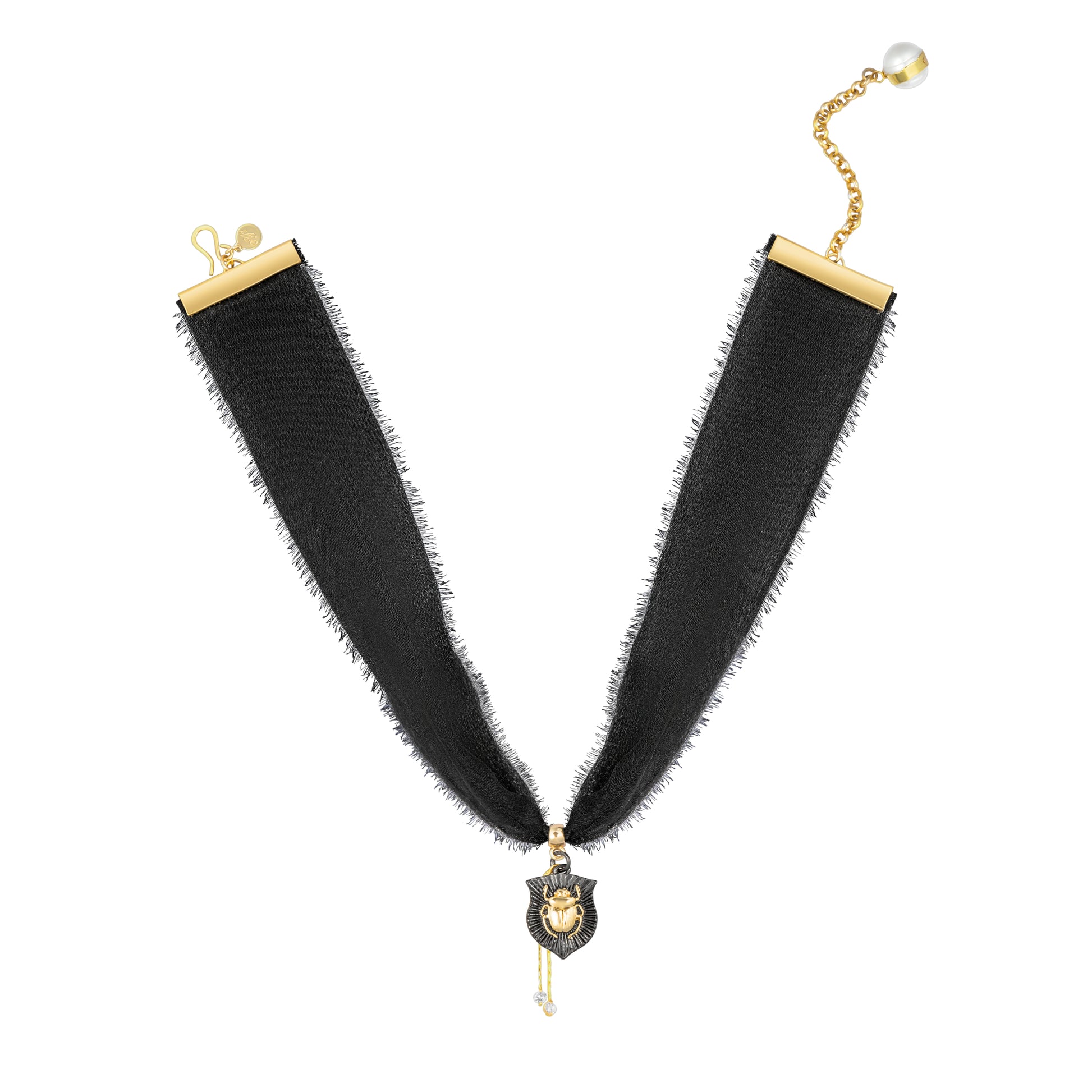 - Materials: Gold filled and brass beetle shield pendant, black crepe de chine silk ribbon with frayed edge, banded freshwater pearl end charm, gold plated cz accents and components