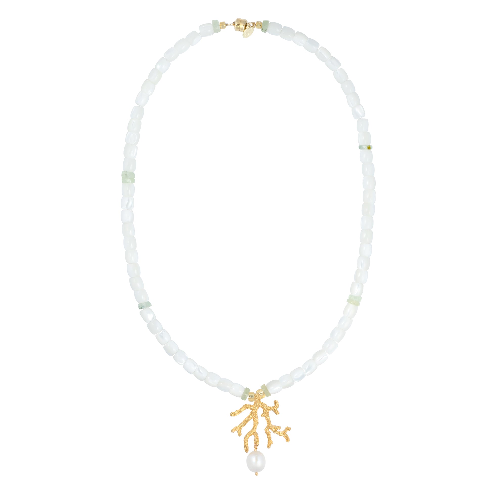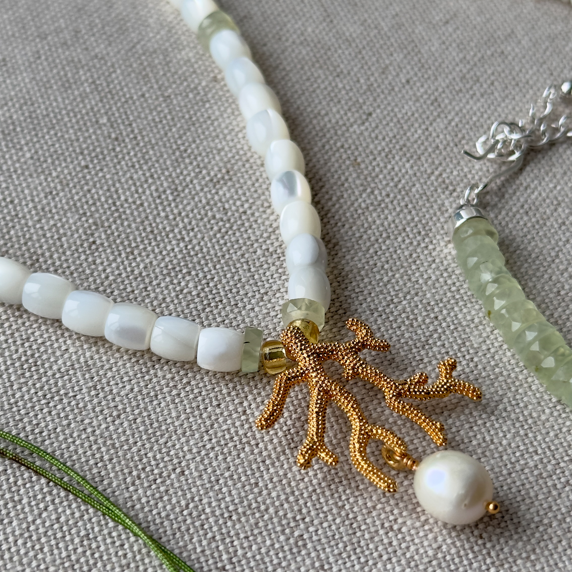 • Materials: Gold plated brass coral pendant, mother of pearl beads, prehnite gemstones, freshwater pearl, Miyuki glass seed beads, gold plated components