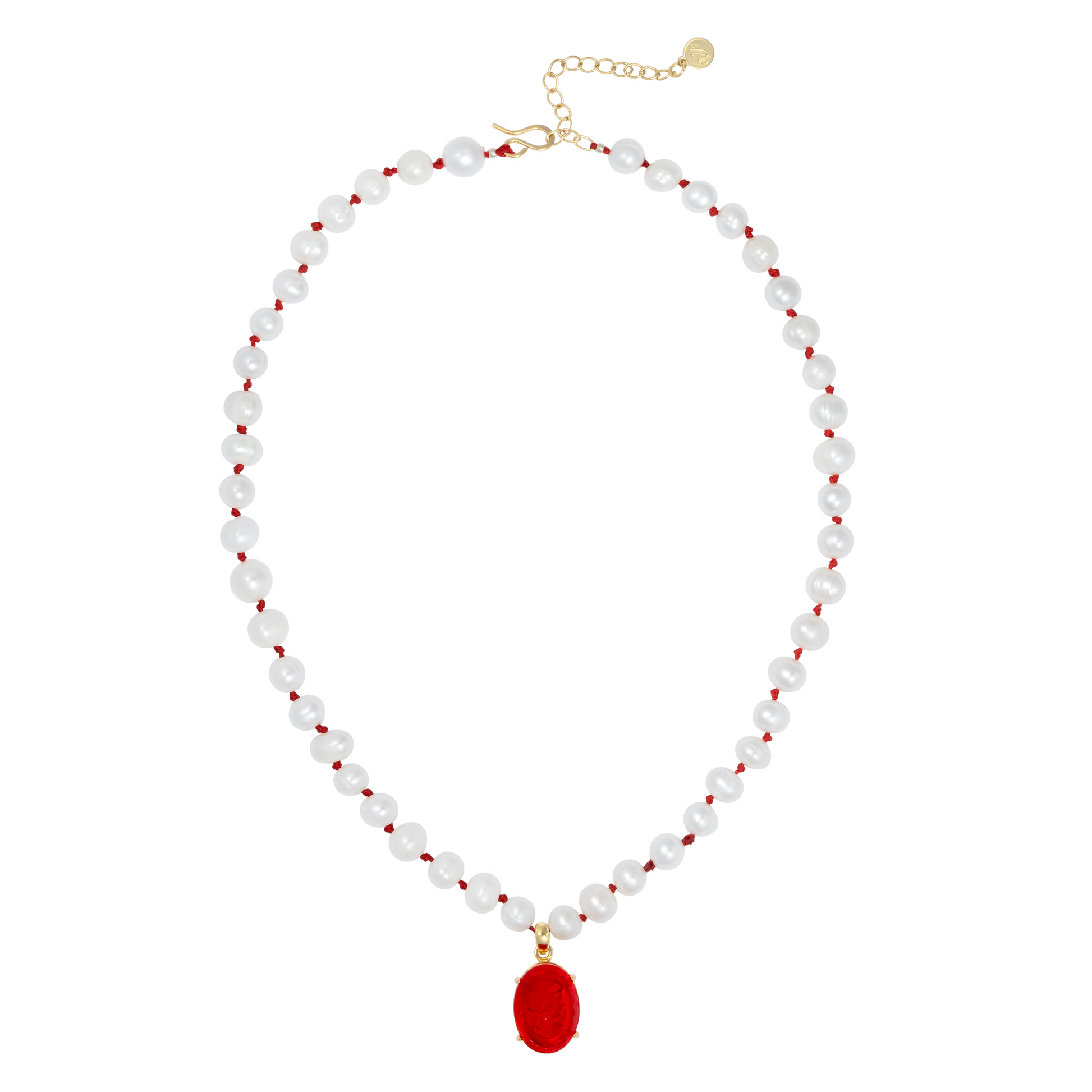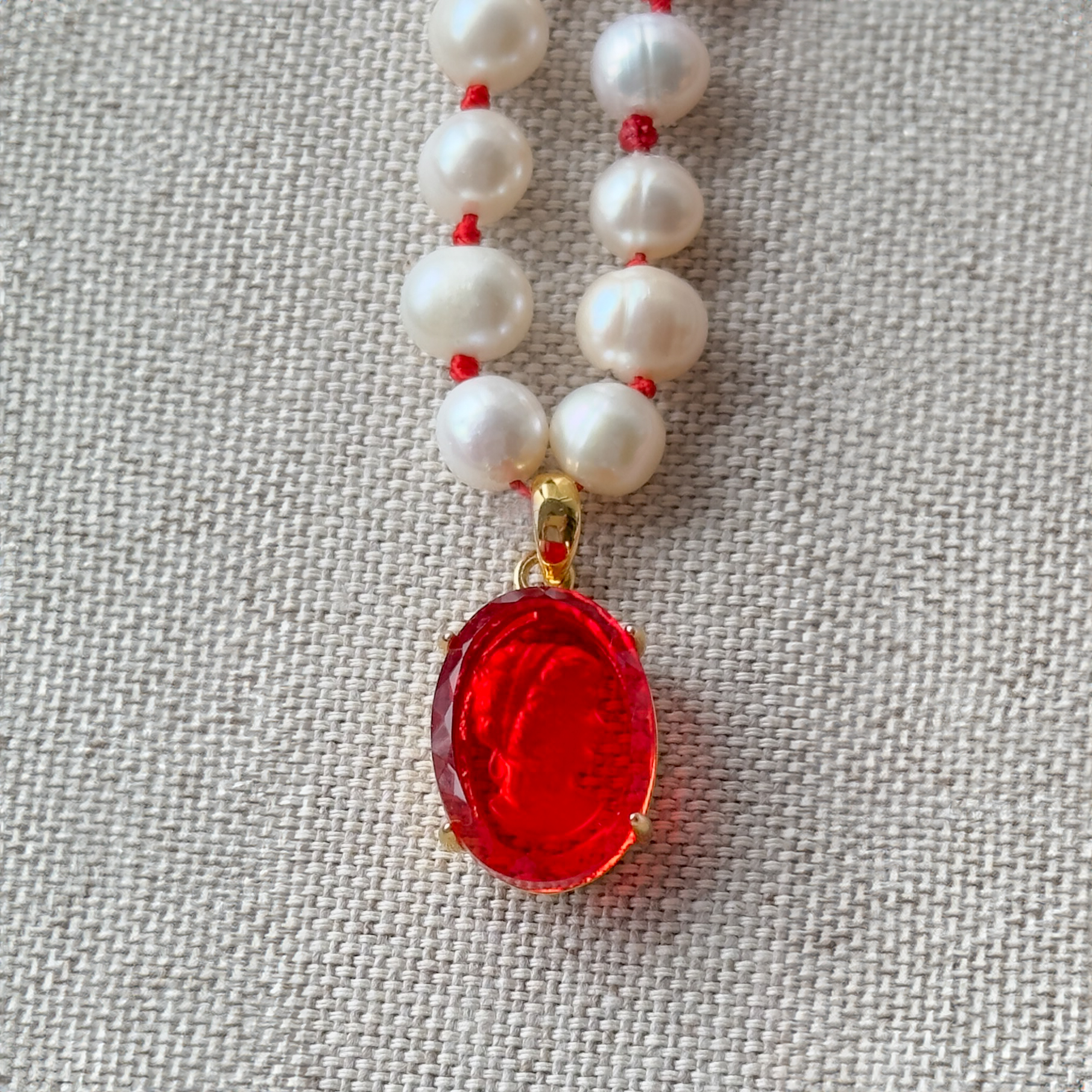 • Materials: Vintage German glass intaglio pendant, freshwater pearls, silk thread, gold filled and gold plated components