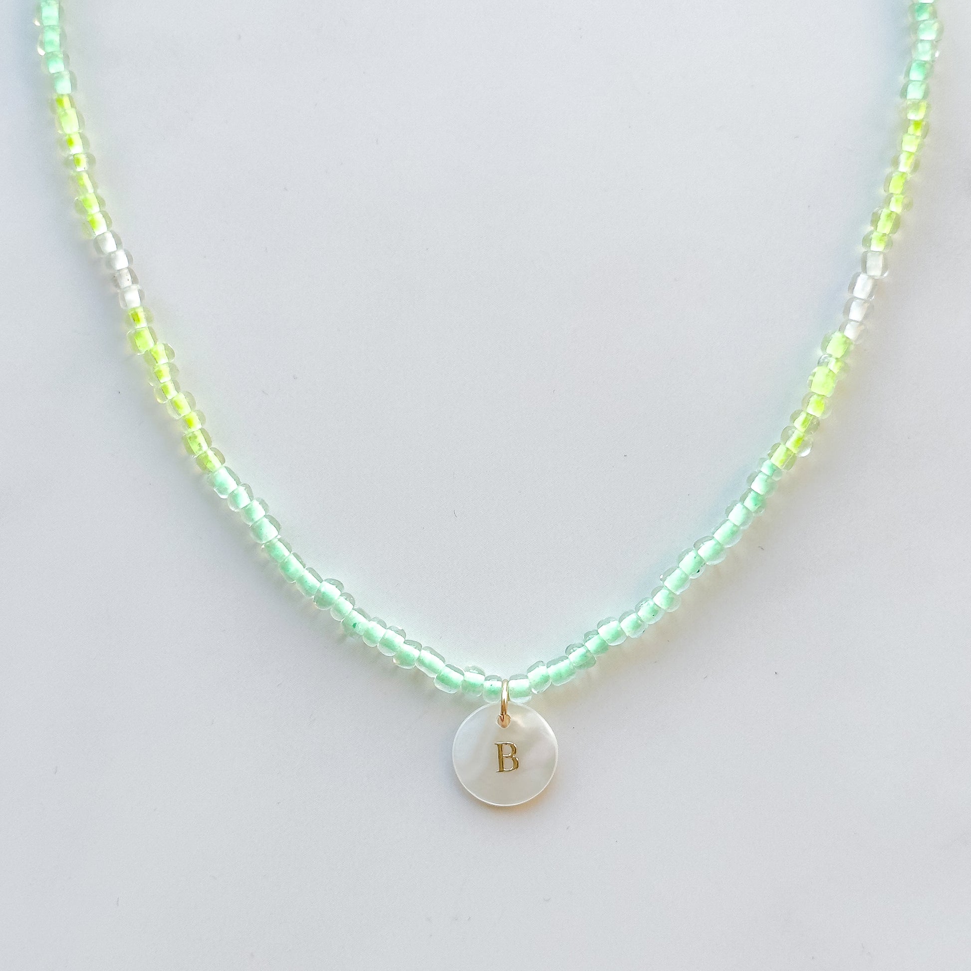 - Handmade glass seed beaded necklace in a seafoam and neon green colorway with optional mother of pearl initial tag (please indicate the letter in the "order special instructions" section of shopping cart)