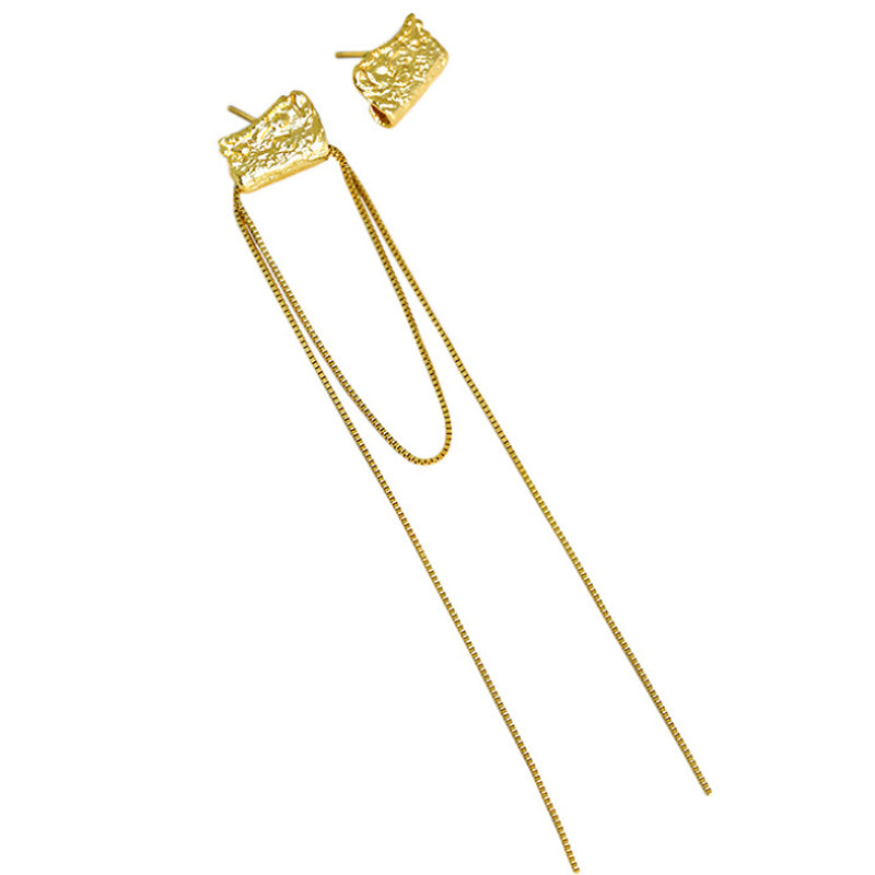 - 18K gold plated Sterling Silver hammered metal and draped chain asymmetrical earrings.