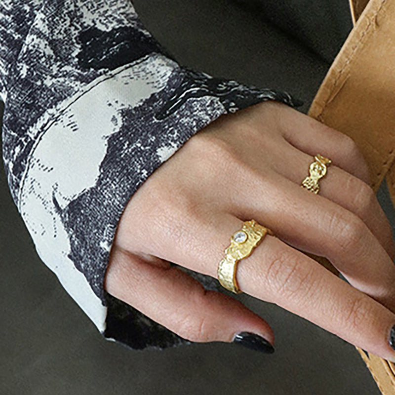 - 18K gold plated Sterling Silver hammered metal open ring with a zircon accent.