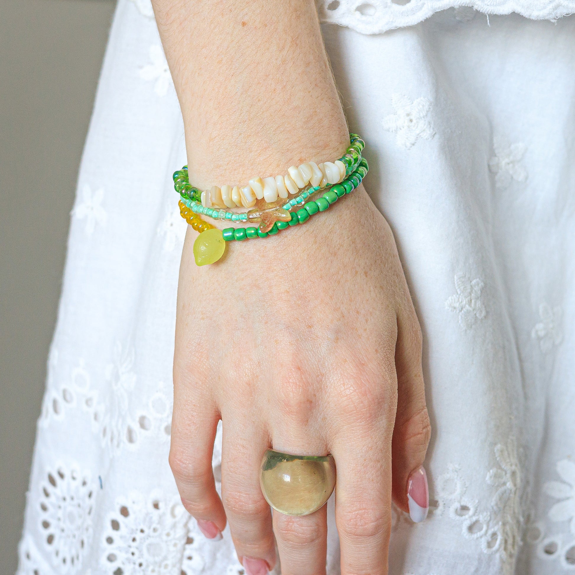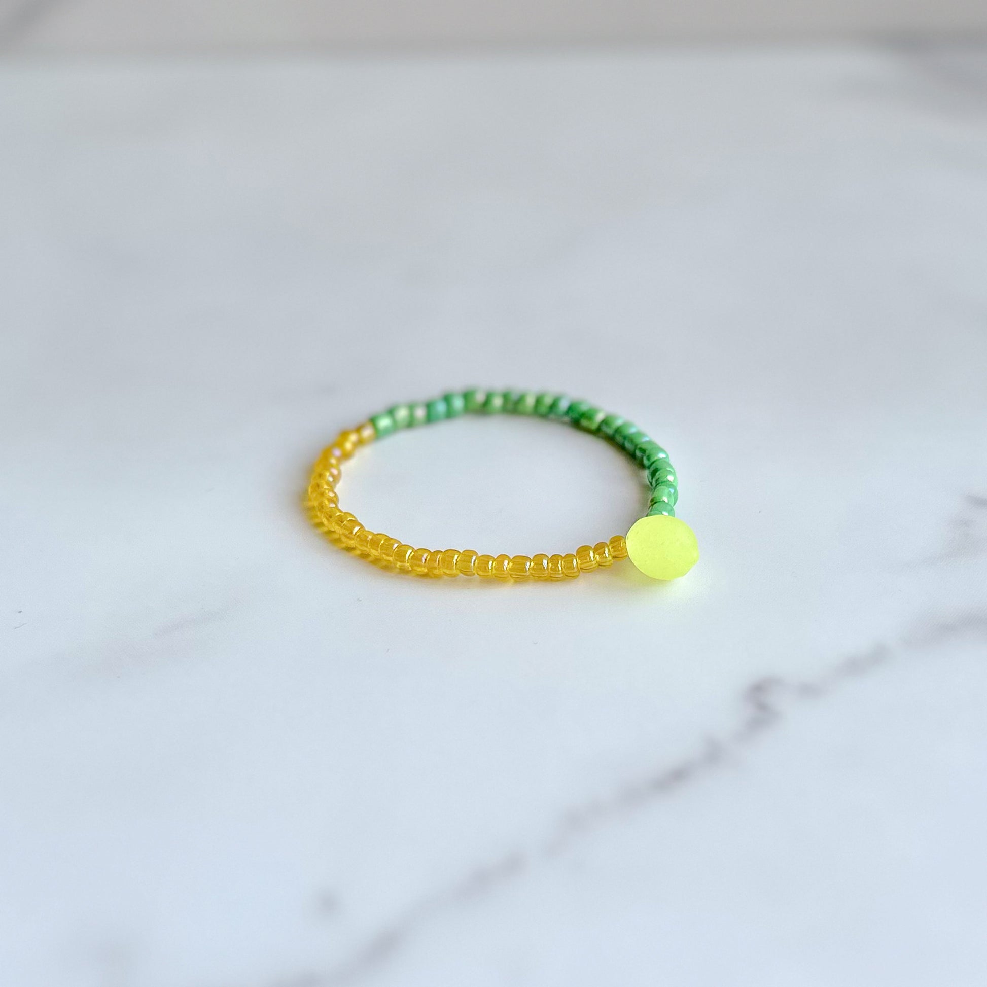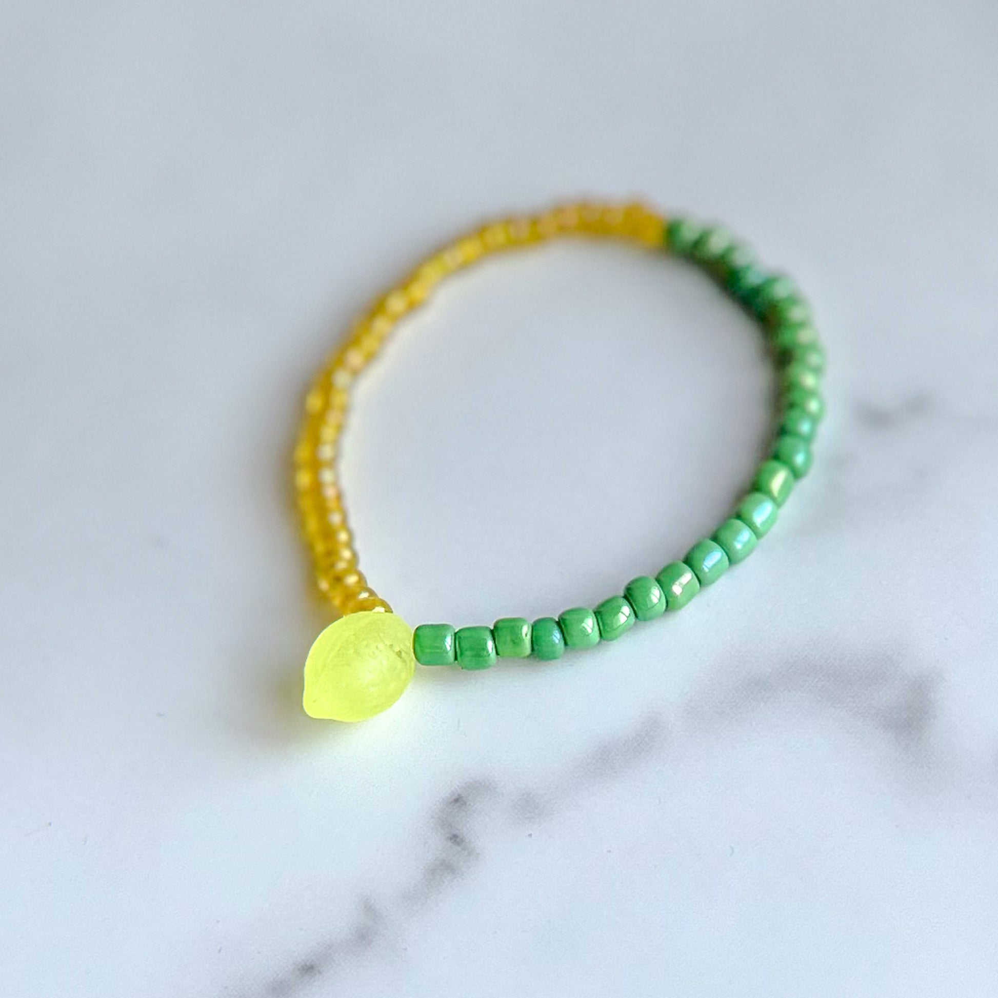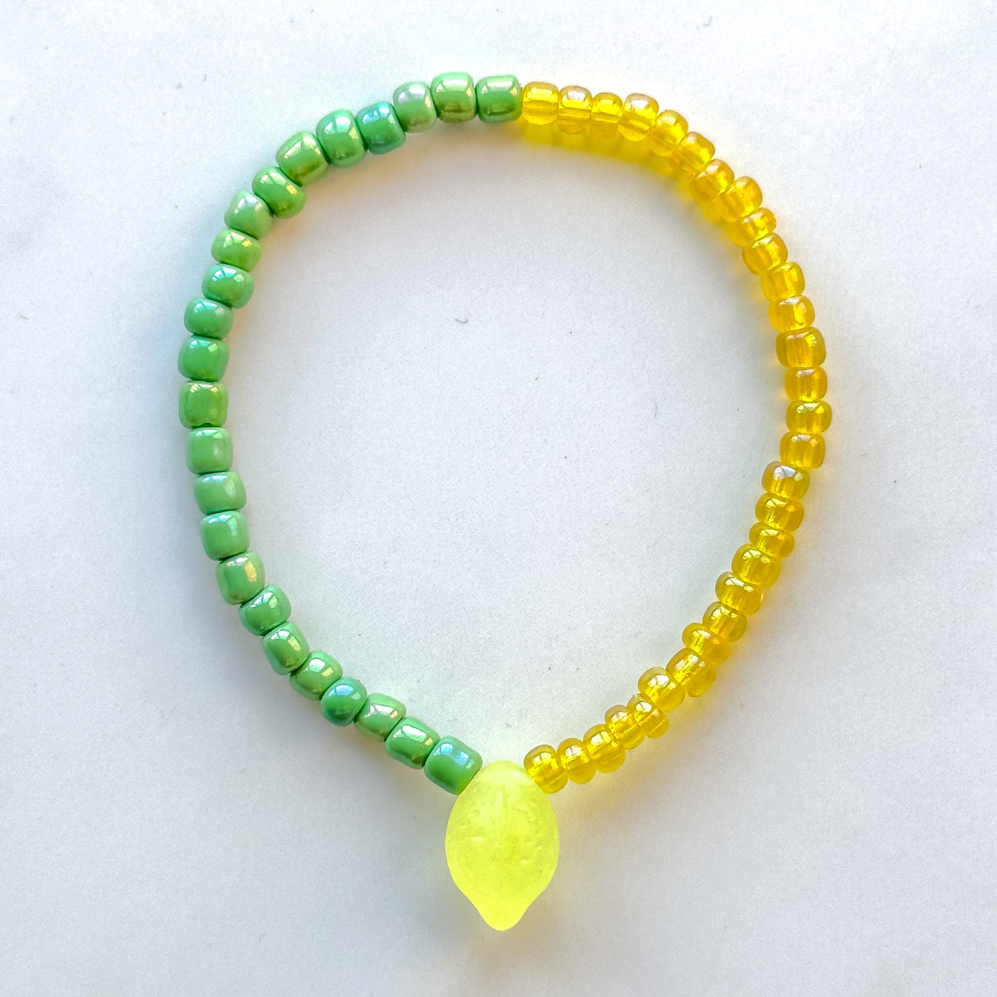 - Handmade glass seed beaded stretch bracelet, accented with a glass lemon charm