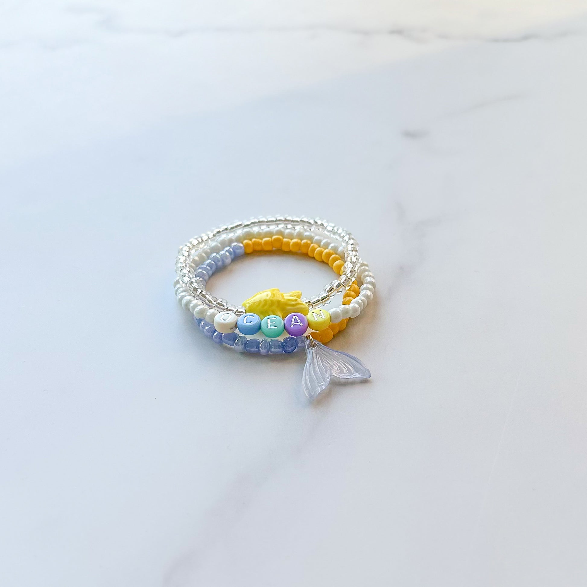 - A bundle of 3 handmade glass beaded stretch bracelets, accented with fish and mermaid charms and pastel letter beads, including the option to personalize the "Marina" style with your name (please indicate the name in the "special instructions" section of shopping cart):