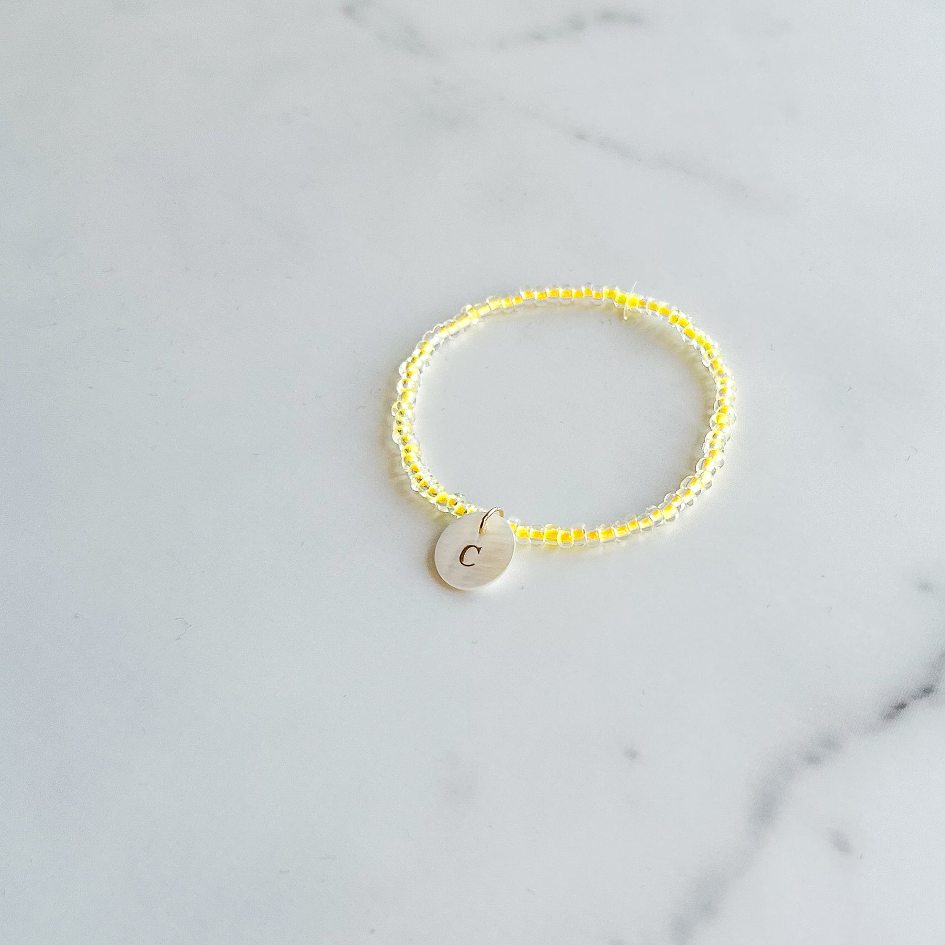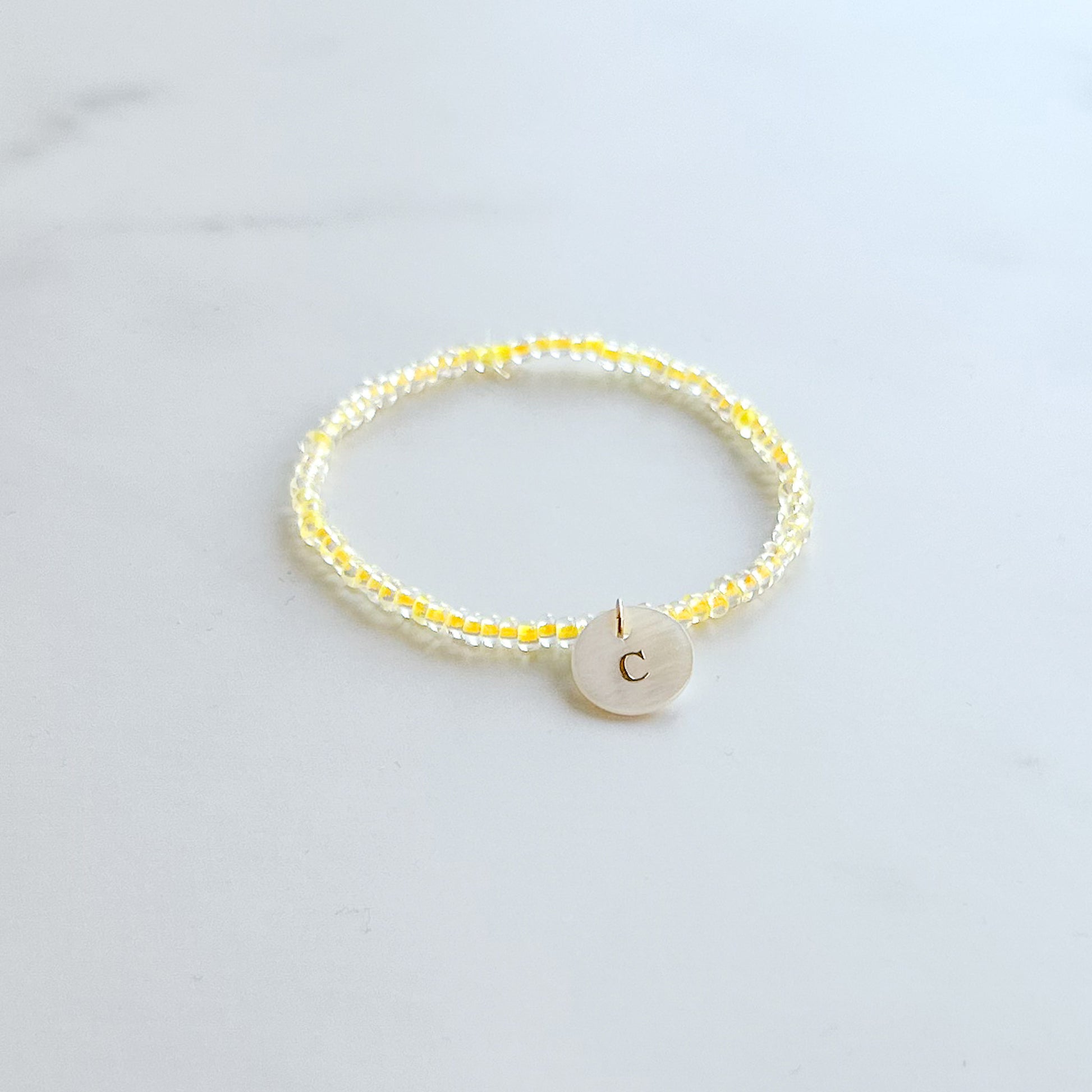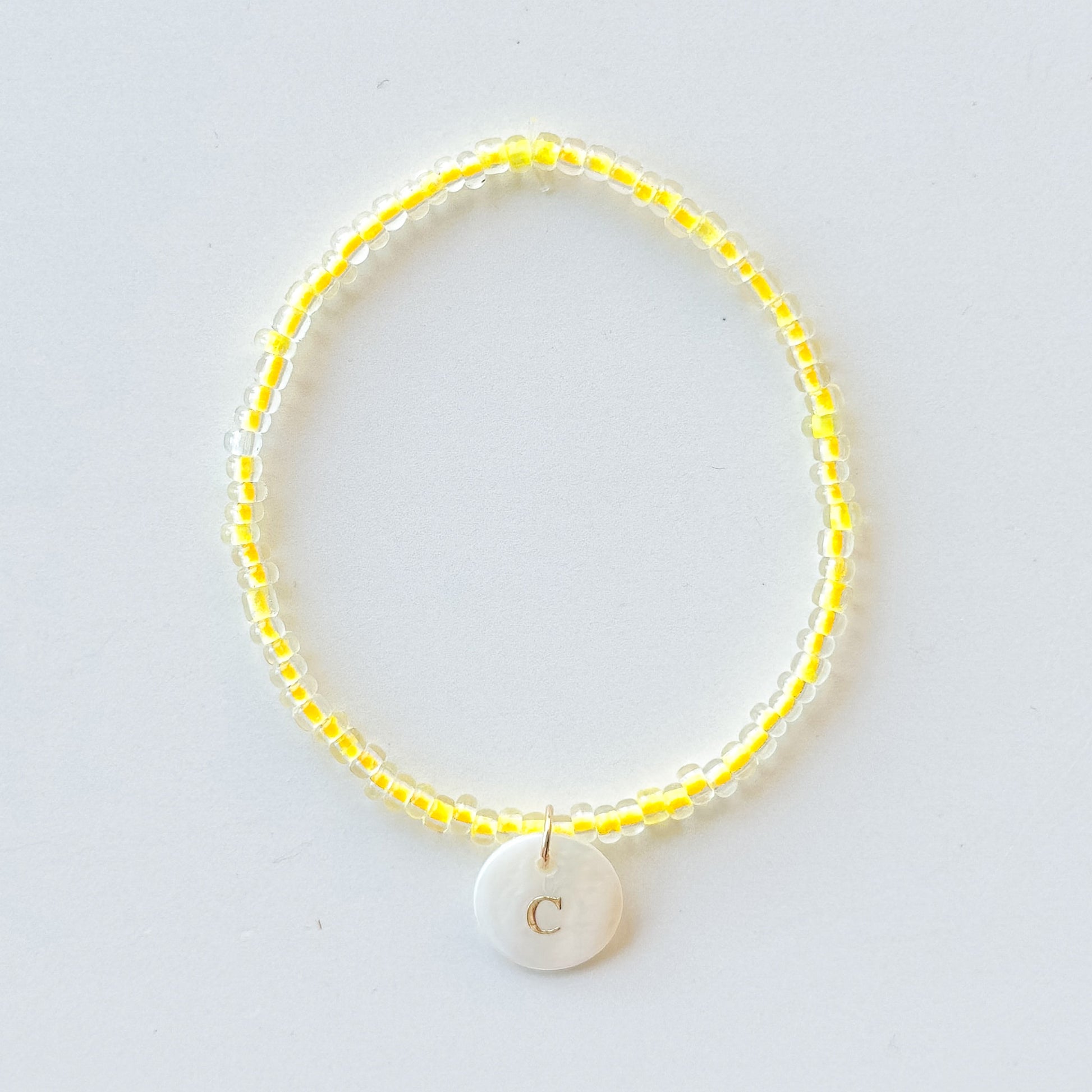 - Handmade glass seed beaded stretch bracelet, accented with a mother of pearl initial tag (please indicate the letter in the "special instructions" section of shopping cart)