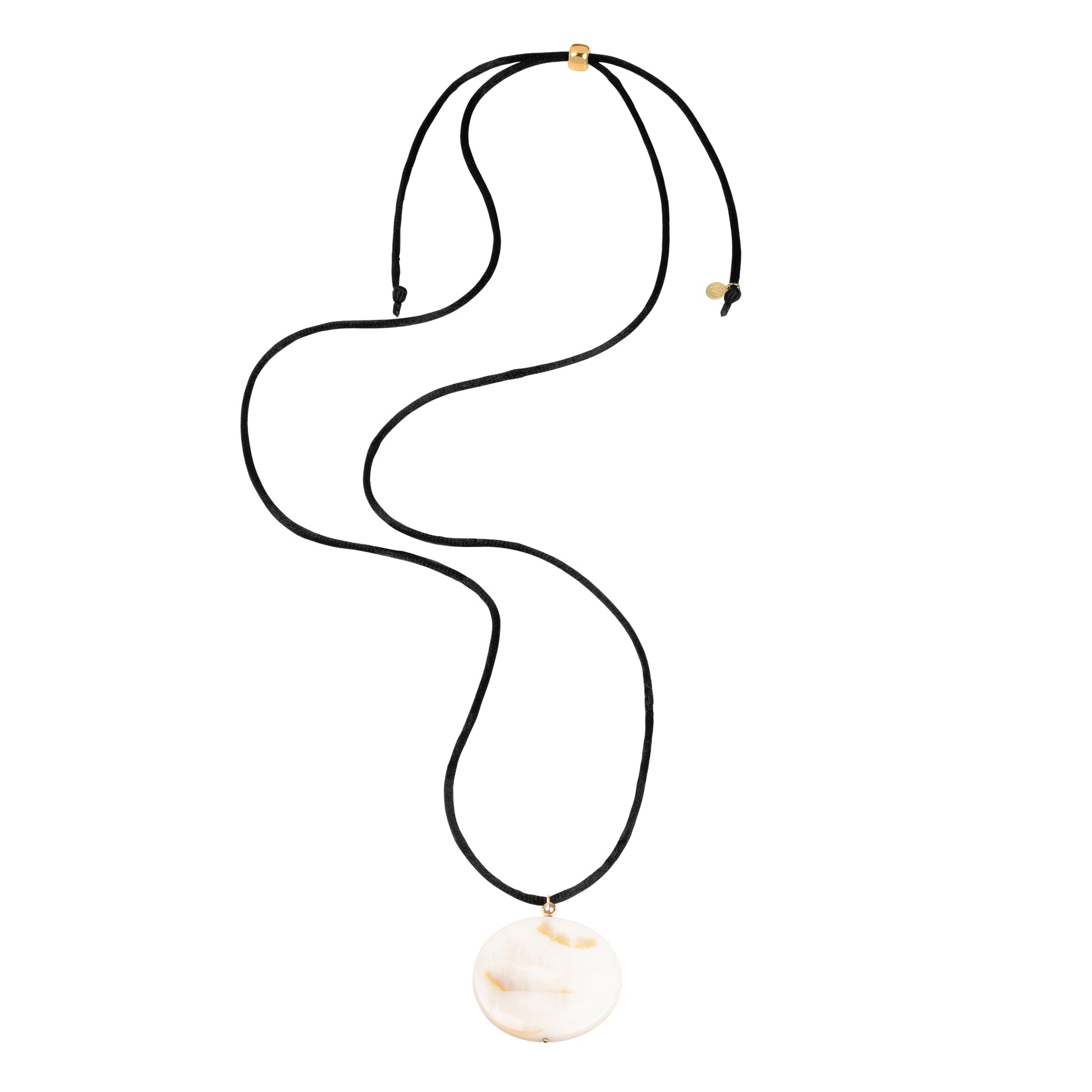 - Materials: Satin nylon cord, mother of pearl coin pendant, gold plated components
