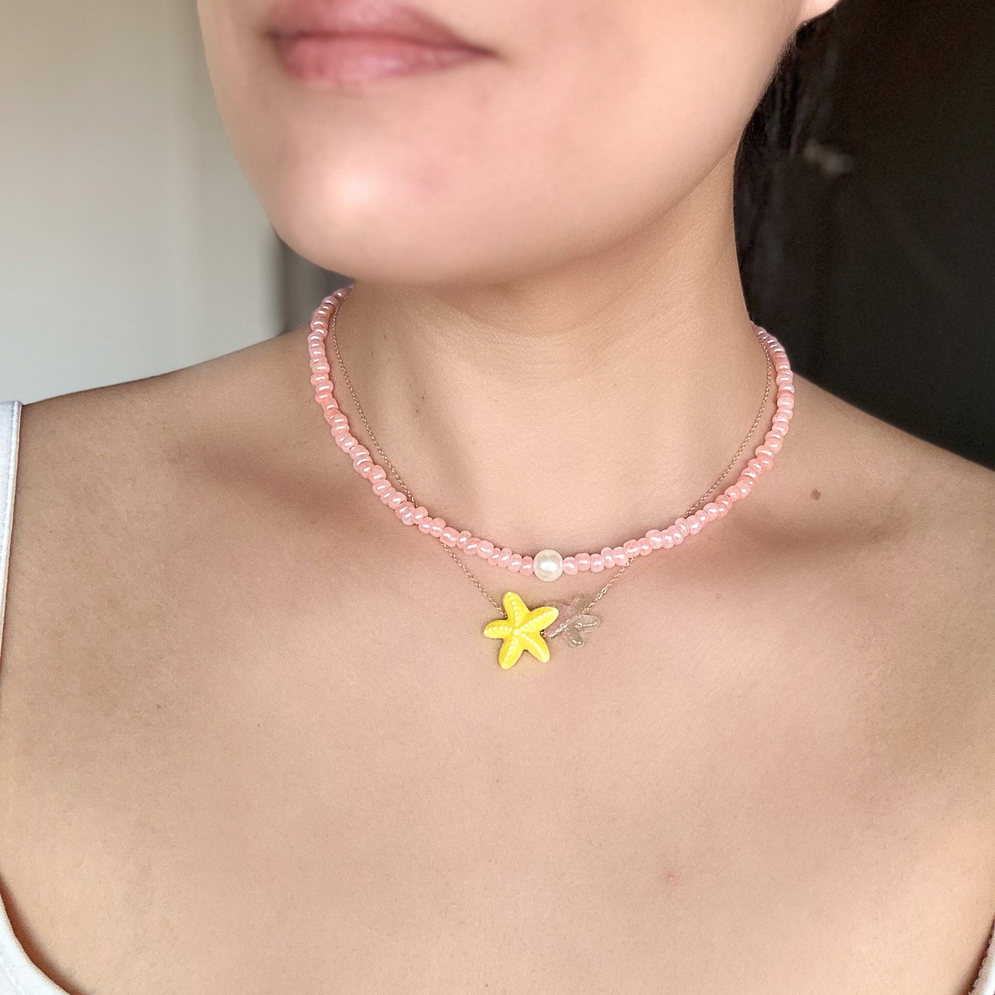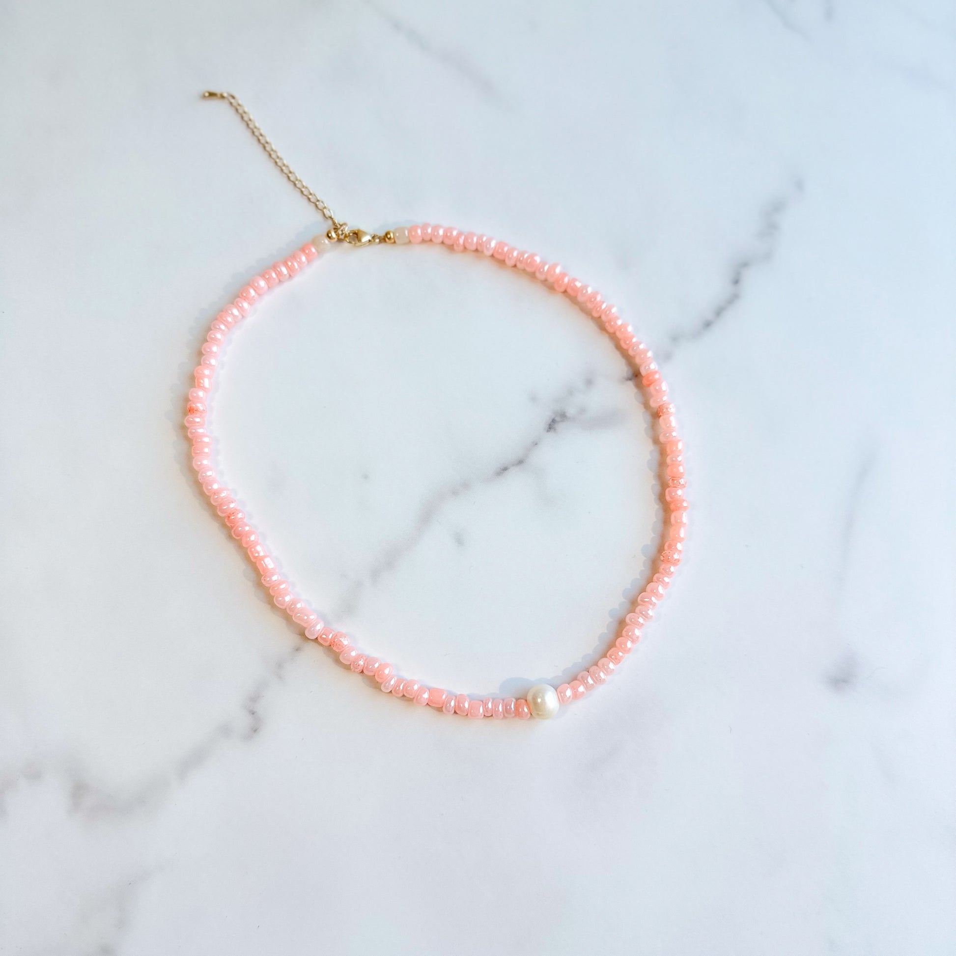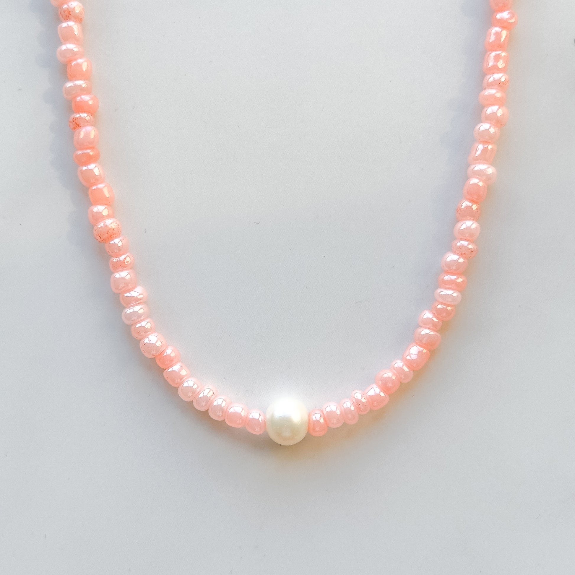 - Handmade glass seed beaded necklace, accented with a fresh water pearl