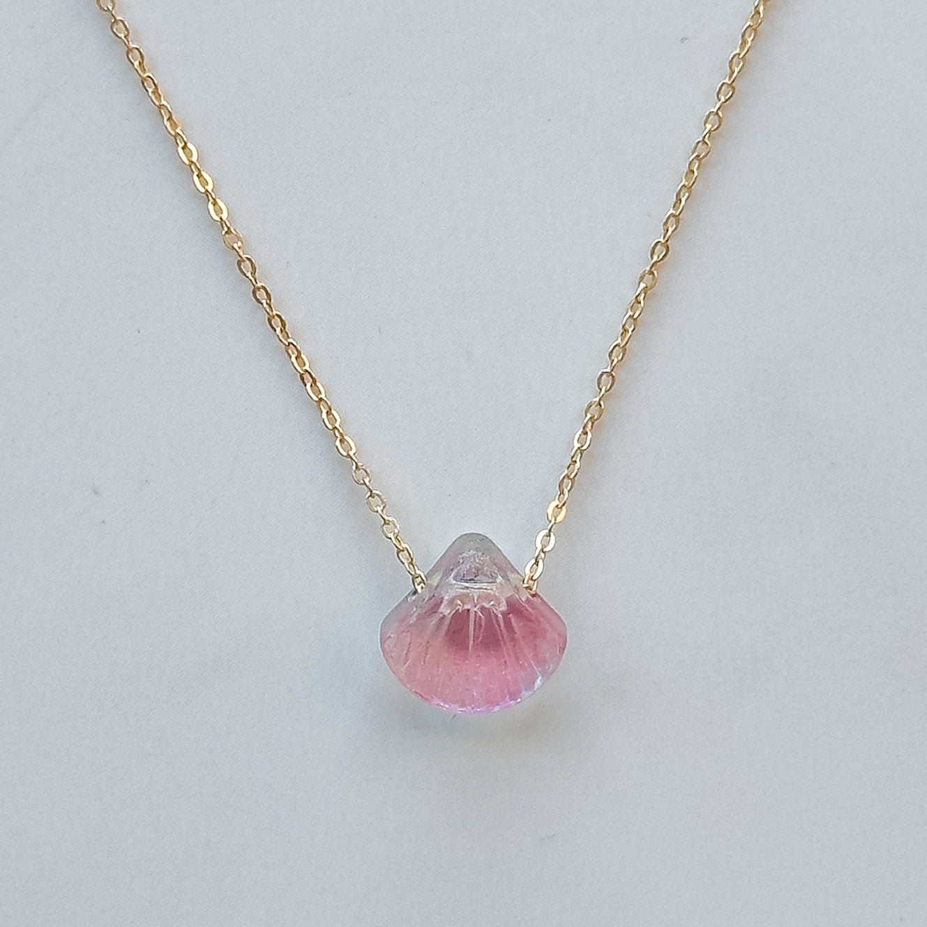 - Gold-filled cable chain necklace with an ombre glass shell charm