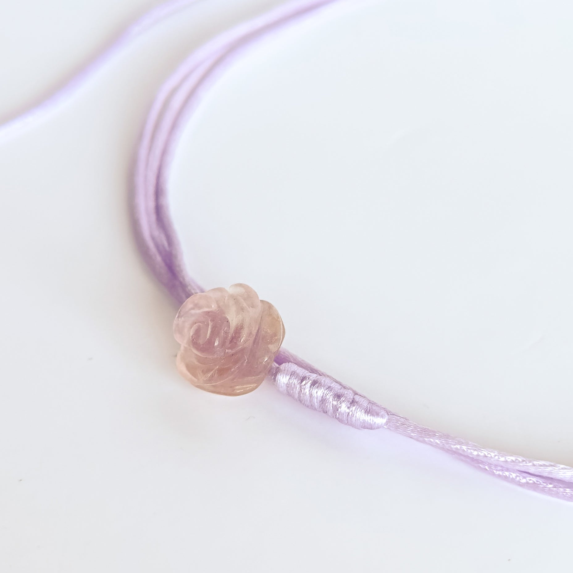 - Materials: Hand-carved fluorite rose charm, satin nylon cord