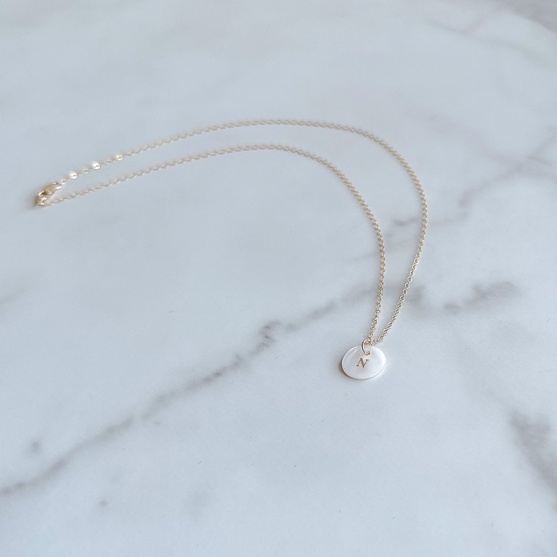 - Gold-filled cable chain necklace with mother of pearl initial tag (please indicate the letter in the "order special instructions" section of shopping cart)