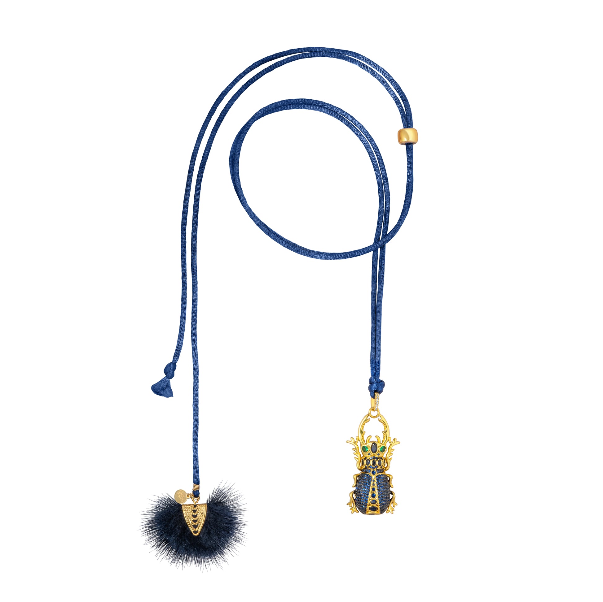 - Materials: Brass cz pave beetle pendant, satin nylon cord, faux mink end charm, gold plated components