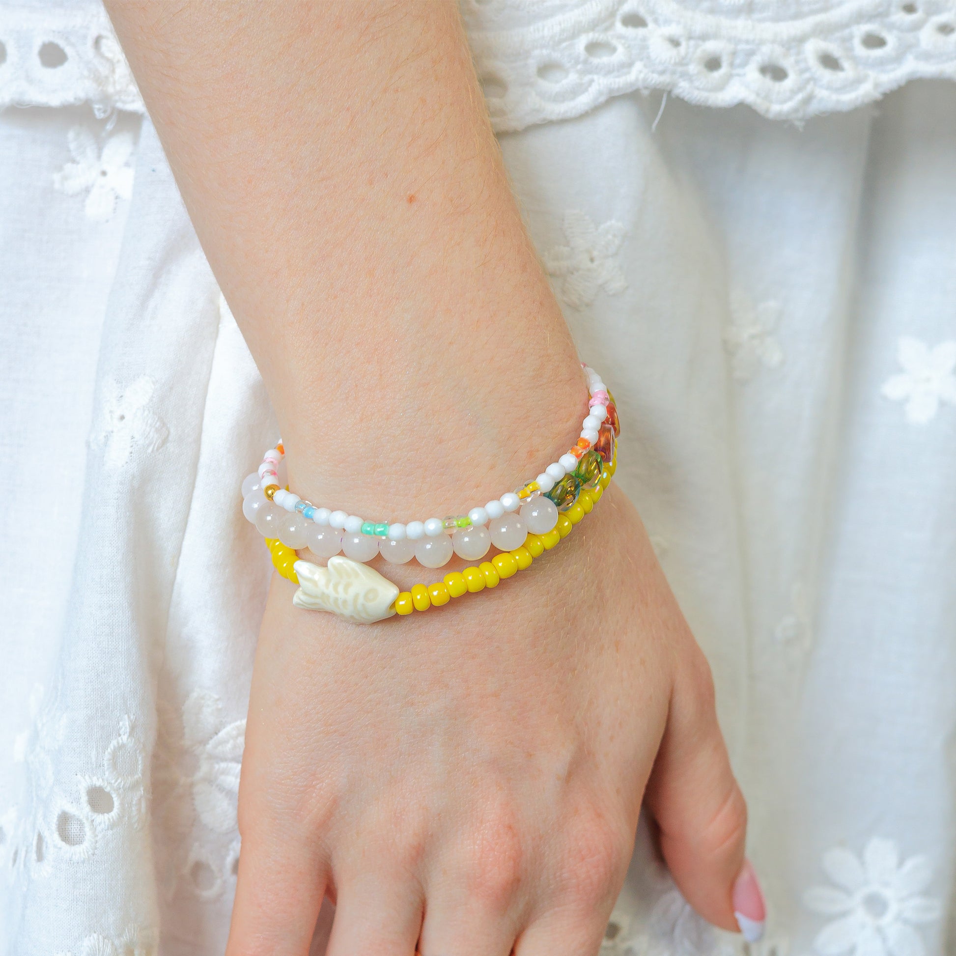 - Handmade glass seed beaded stretch bracelet, accented with a ceramic fish charm