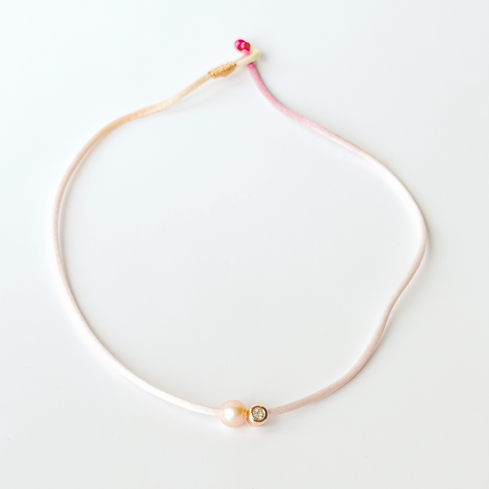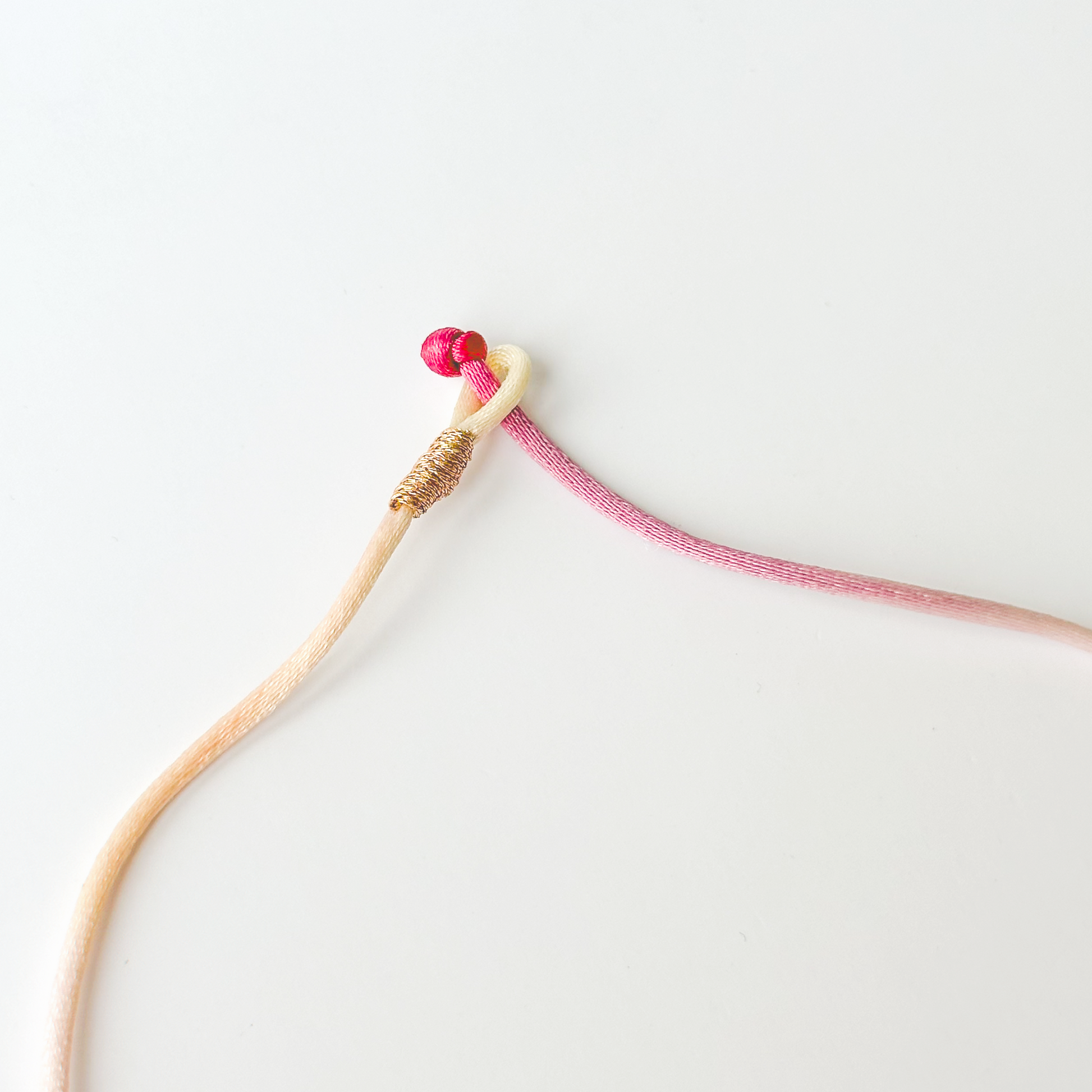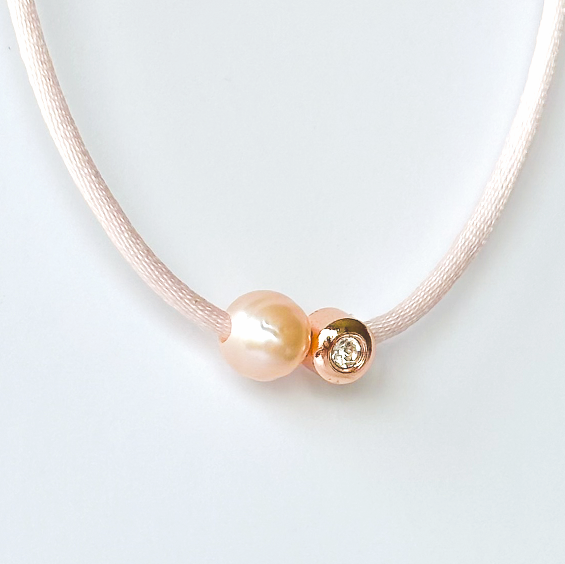 • Materials: Pink freshwater pearl, rose gold plated brass & crystal component, ombre satin nylon cord, metallic polyester thread