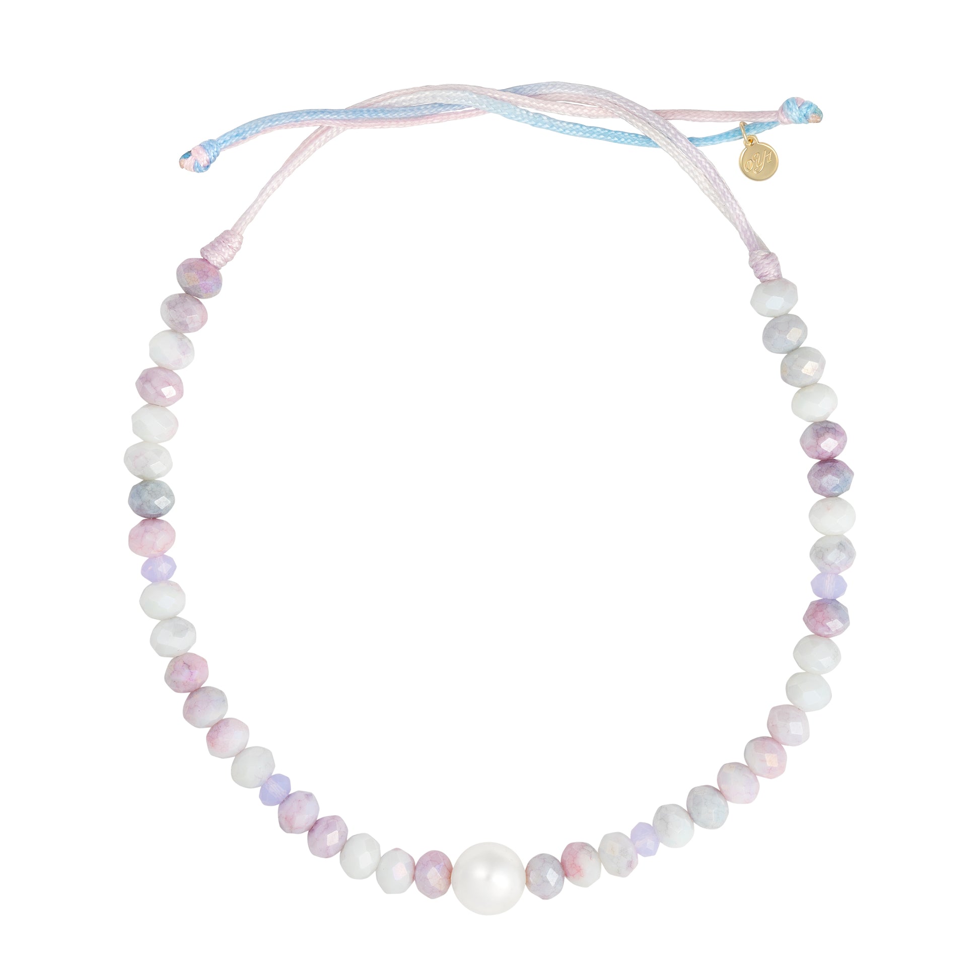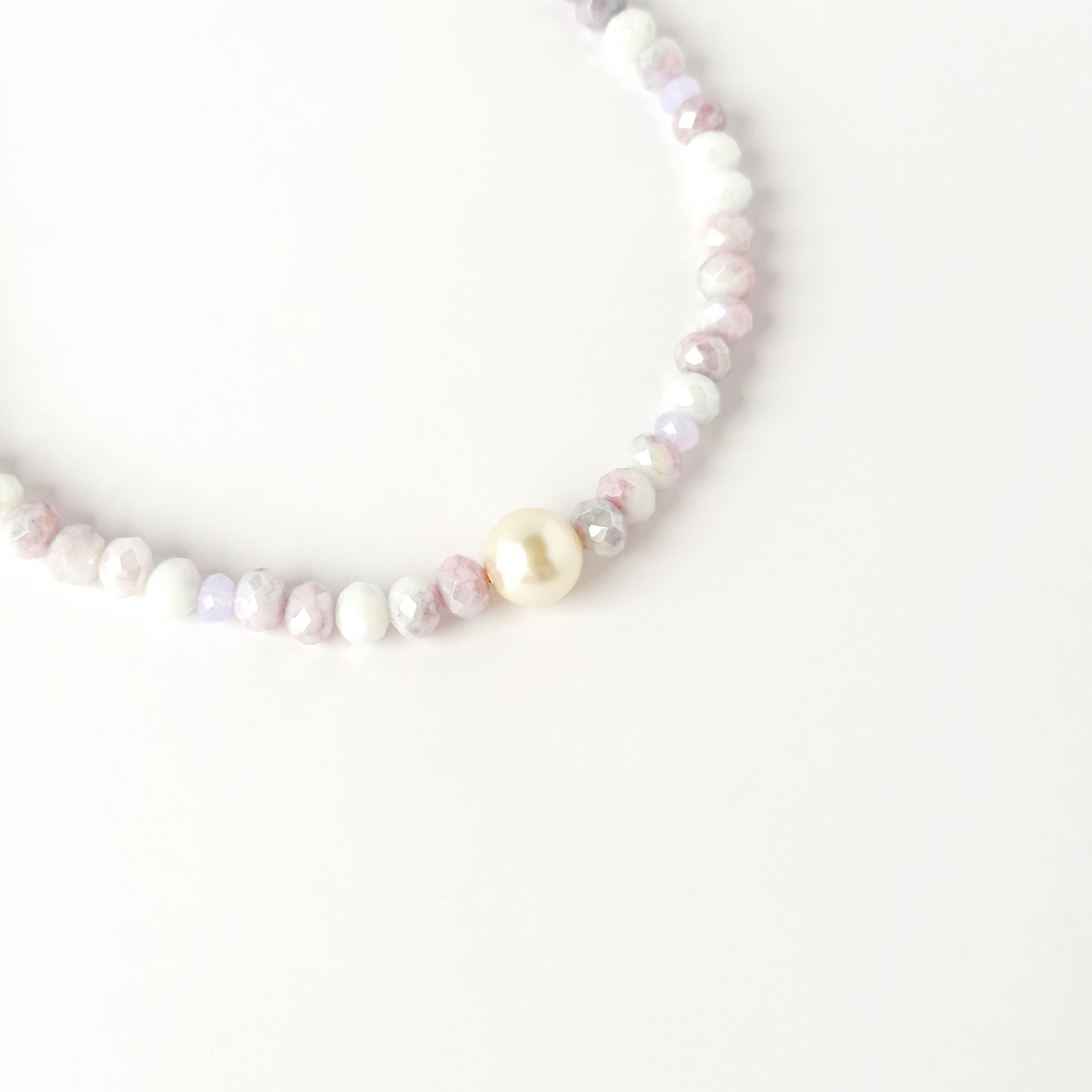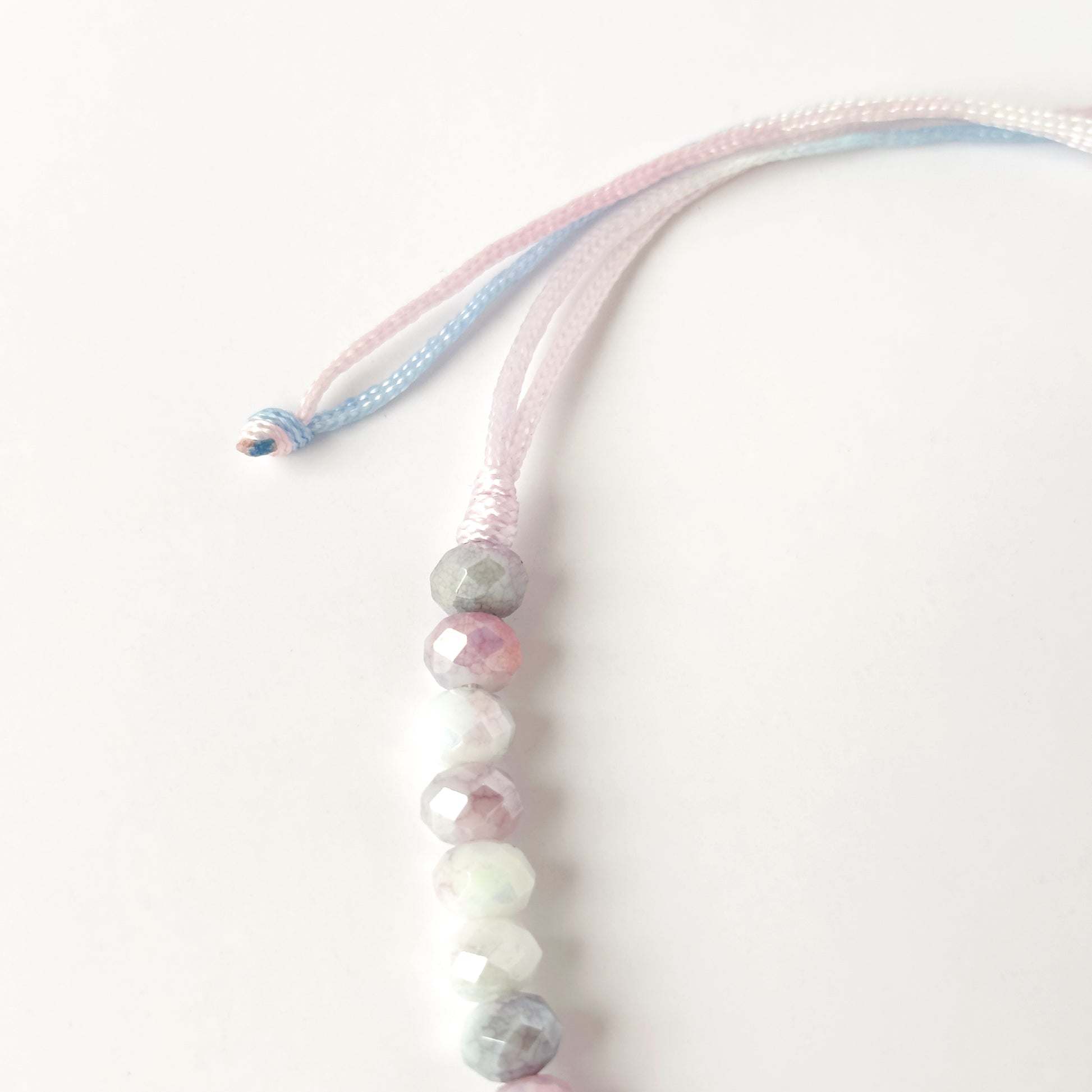 - Materials: Marbled crystal stone beads, vintage lavender Swarovski crystal beads, Swarovski glass pearl, ombre pastel nylon cord, gold plated components