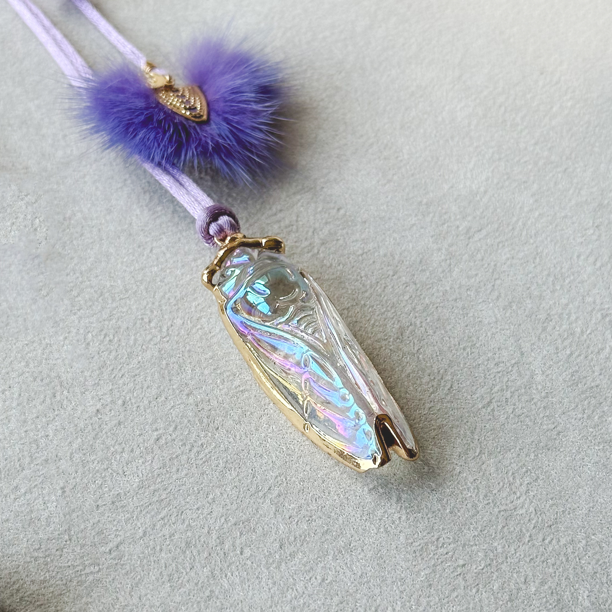 - Materials: Gold trimmed iridescent glass cicada pendant, satin nylon cord, faux mink end charm, gold plated components