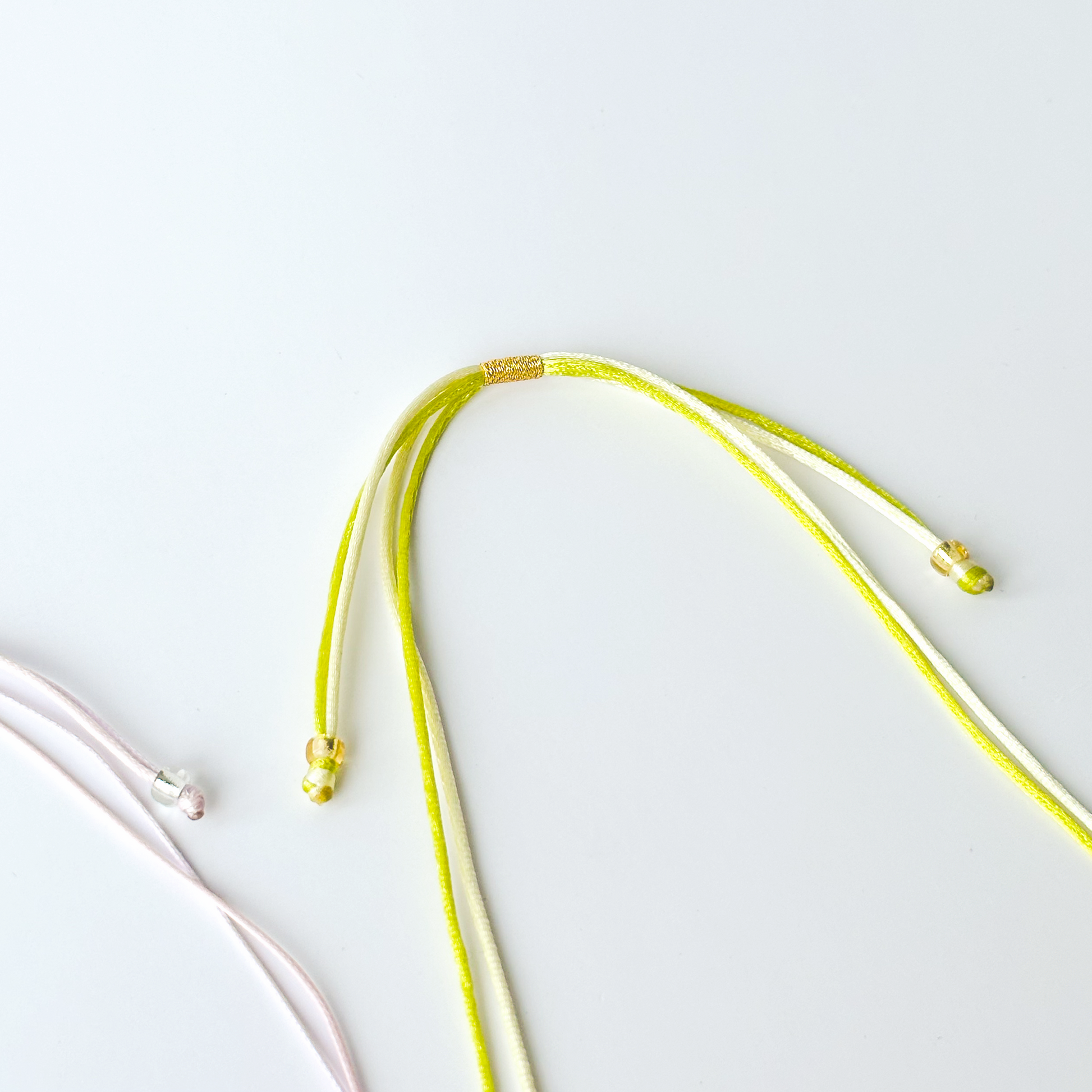 - Materials: Sterling silver/gold plated brass letter bead, waxed polyester/satin nylon cord, Miyuki foiled glass seed beads, metallic polyester thread