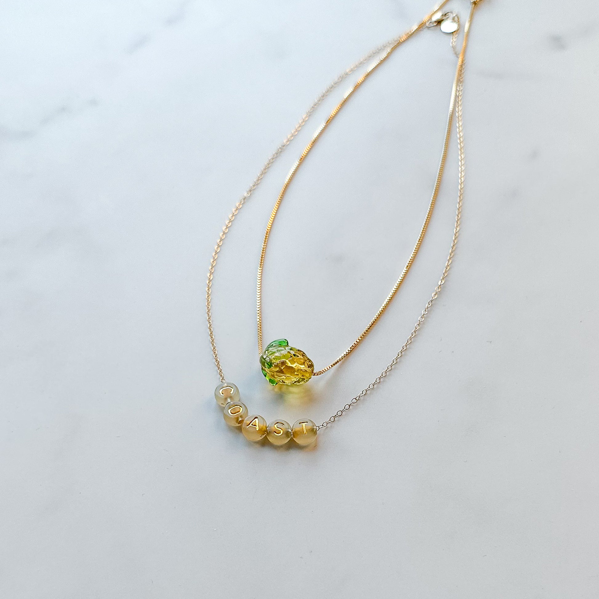 - A duo of gold-filled box and cable chain necklaces decorated with a pineapple charm and glow-in-the-dark letter beads, including the option to personalize with your name for the "Thalassa" style (please indicate the name in the "special instructions" section of shopping cart):