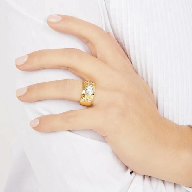 - 18K gold plated Sterling Silver thick band ring with oval cz stone.