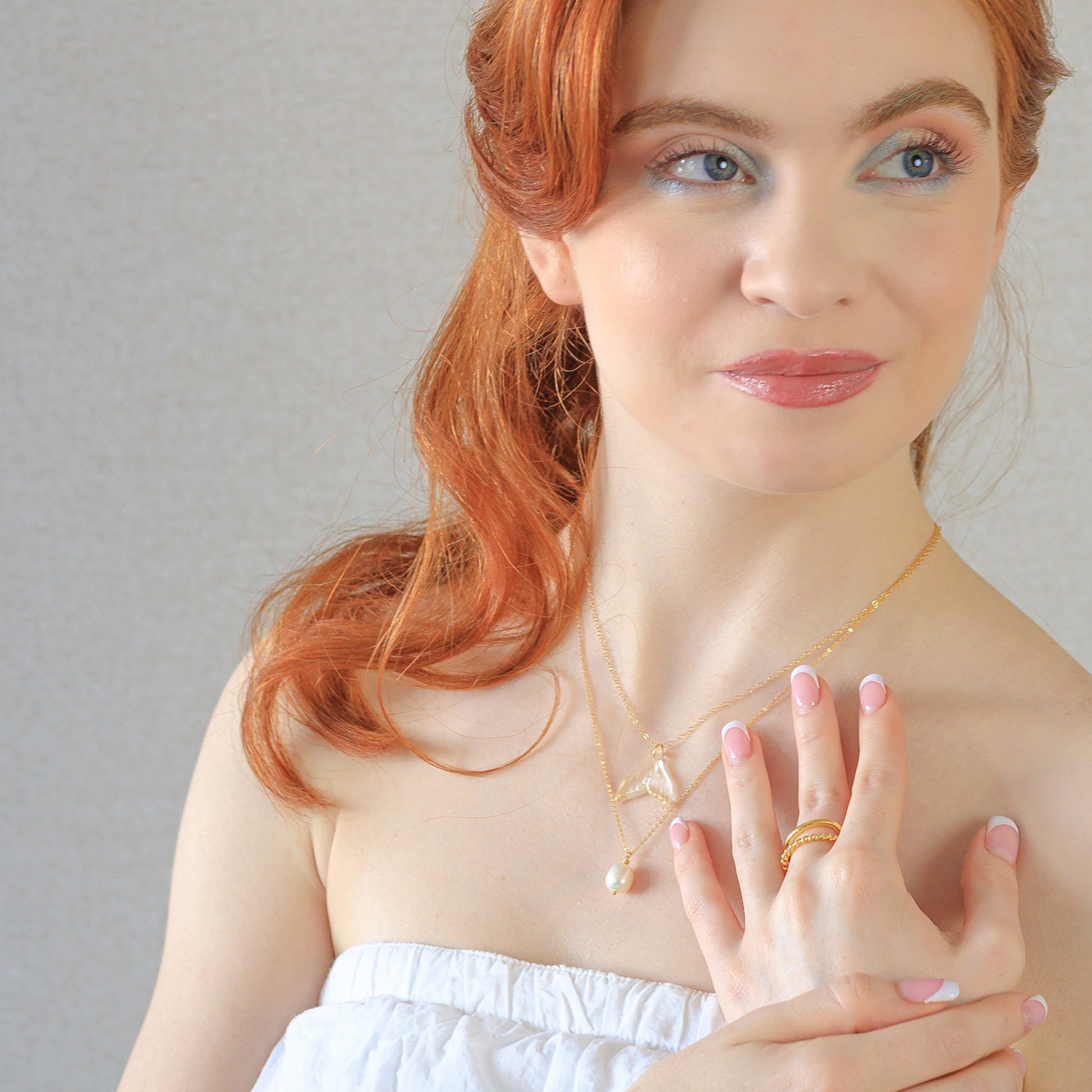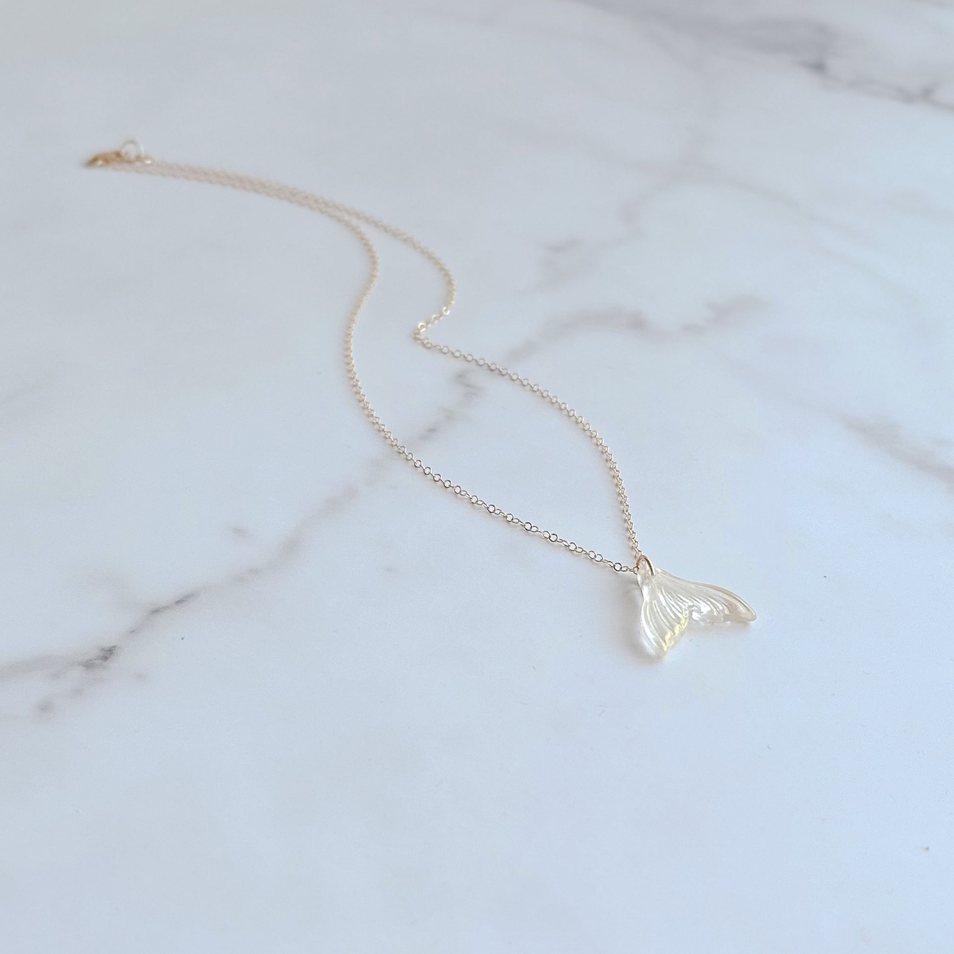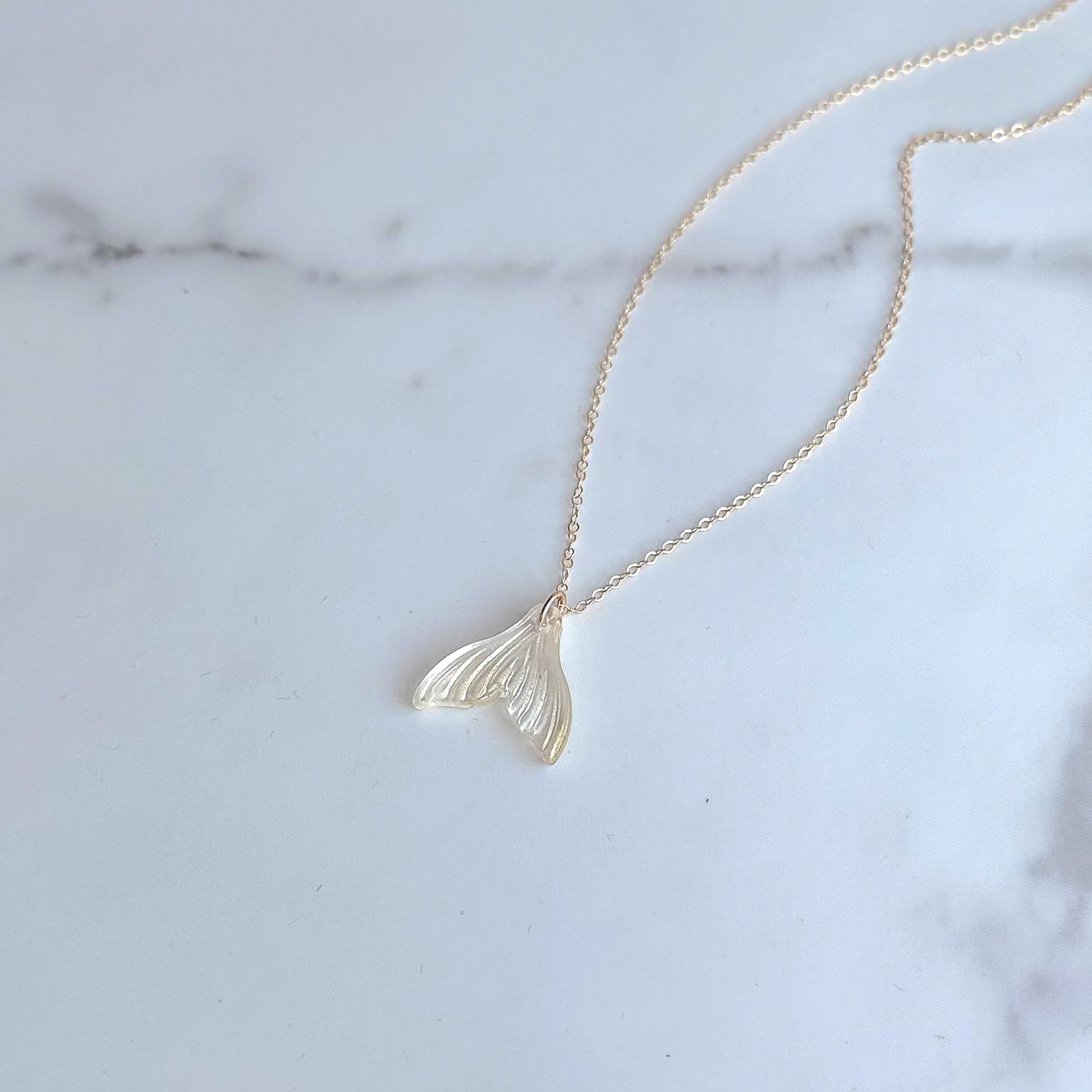 - Gold-filled cable chain necklace with an aurora glass mermaid tail charm