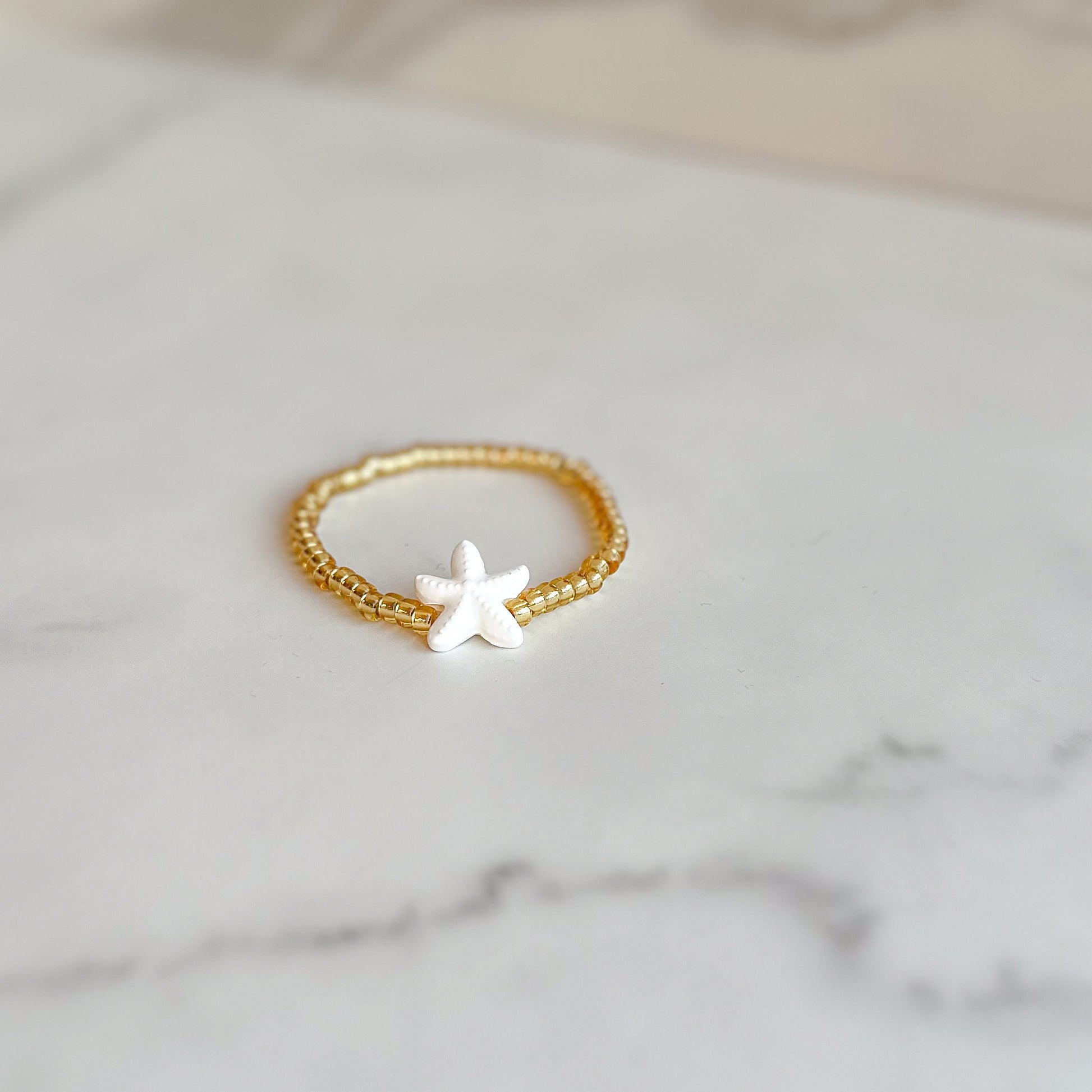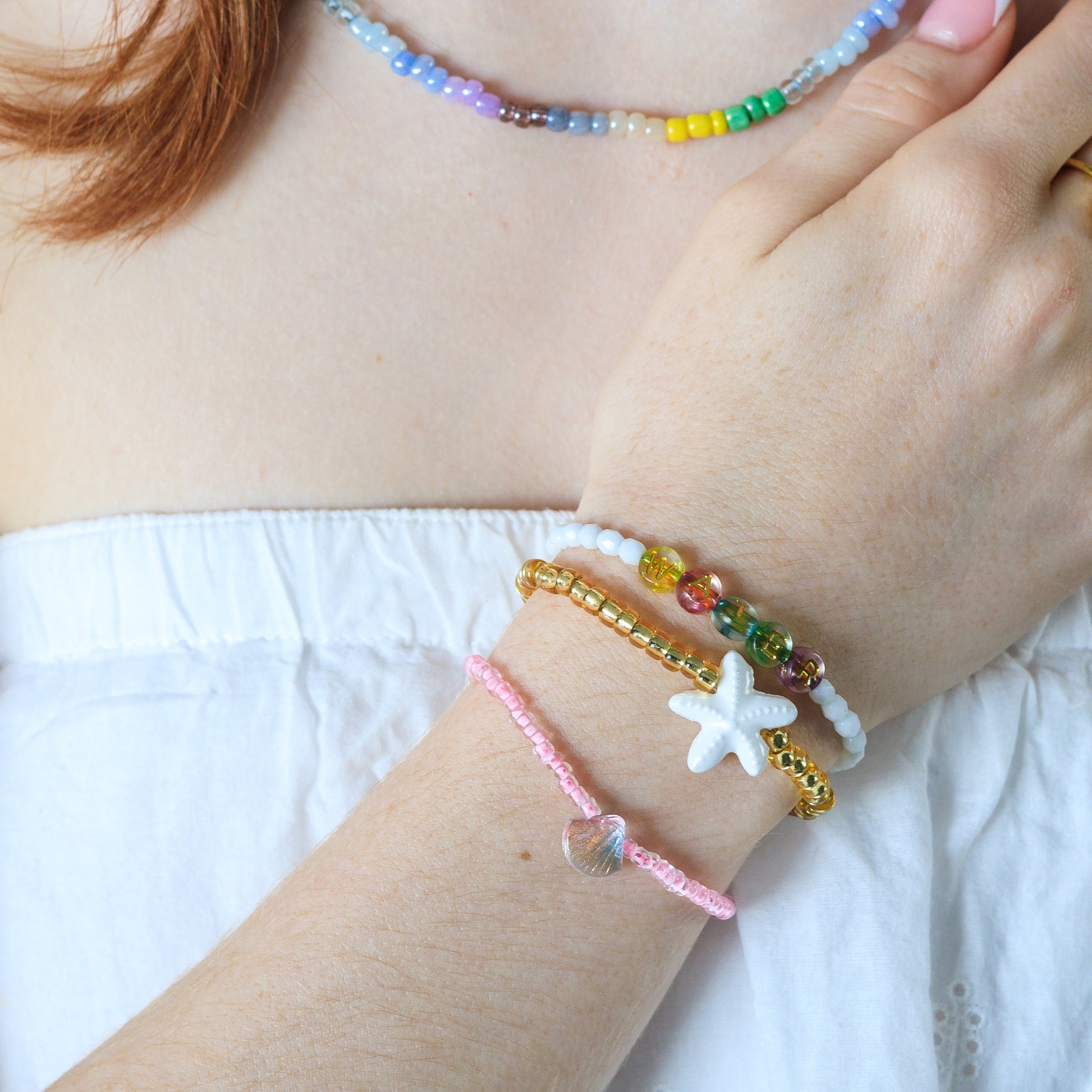 - Handmade Miyuki glass beaded stretch bracelet, accented with a ceramic starfish charm