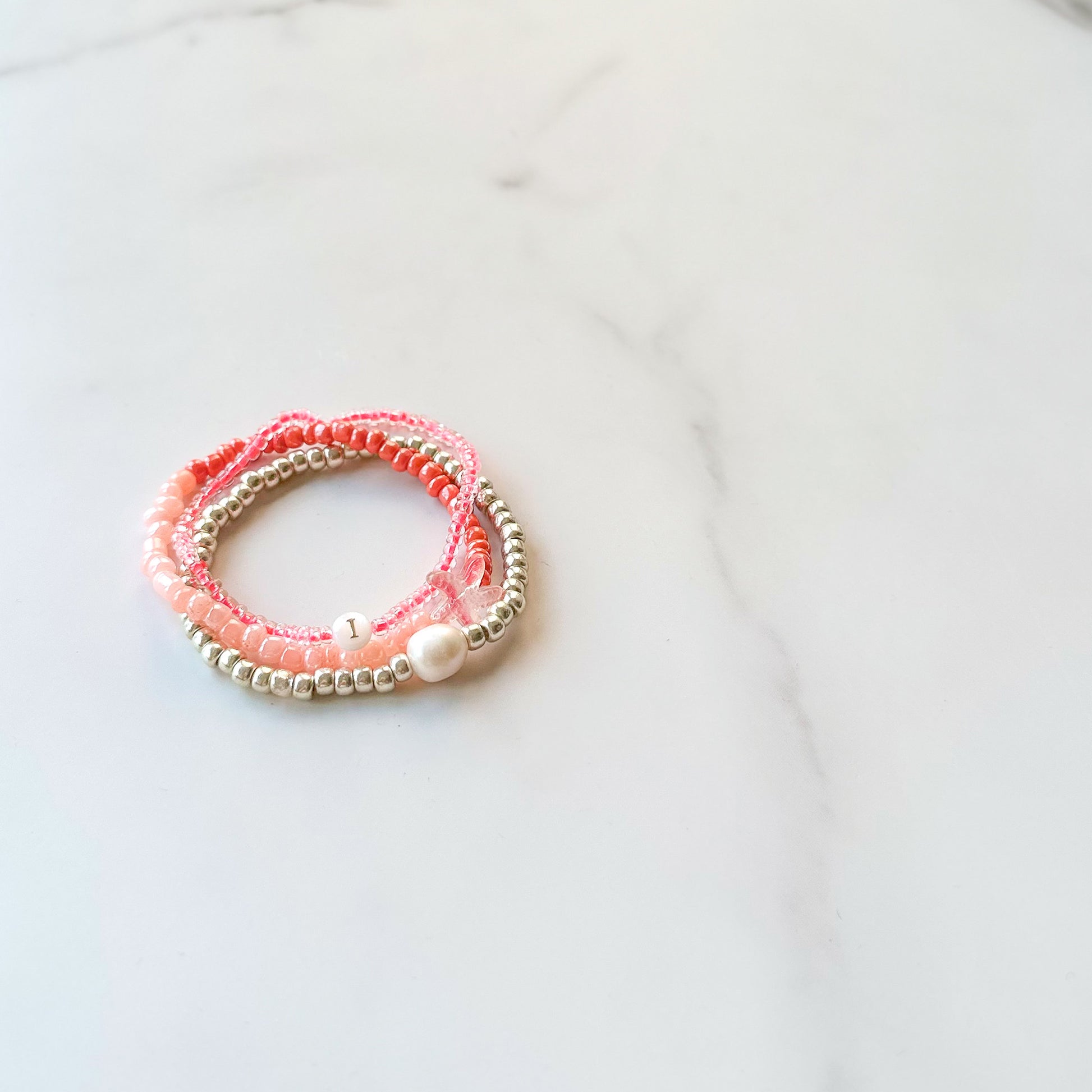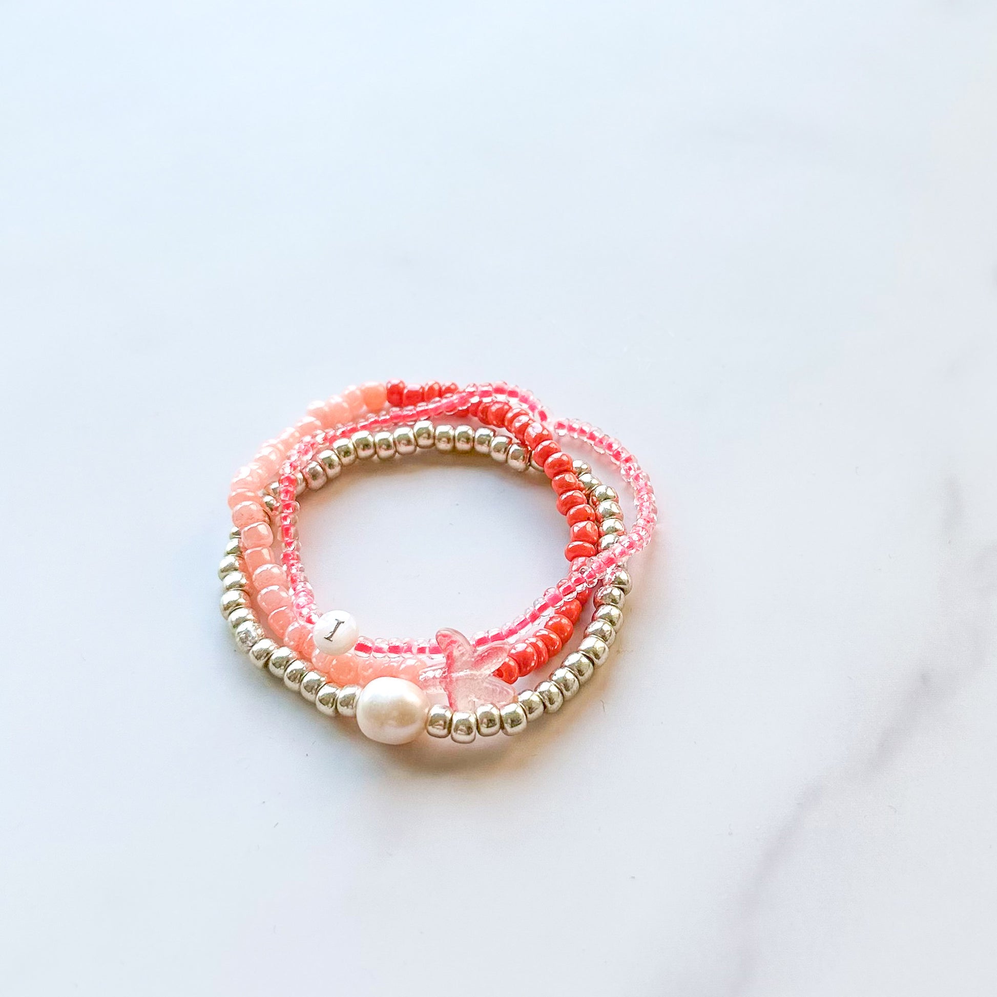 - A bundle of 3 handmade glass beaded stretch bracelets, accented with starfish and freshwater pearl charms, including the option to add a mother of pearl initial bead to the "Ondine" style (please indicate the letter in the "special instructions" section of shopping cart):