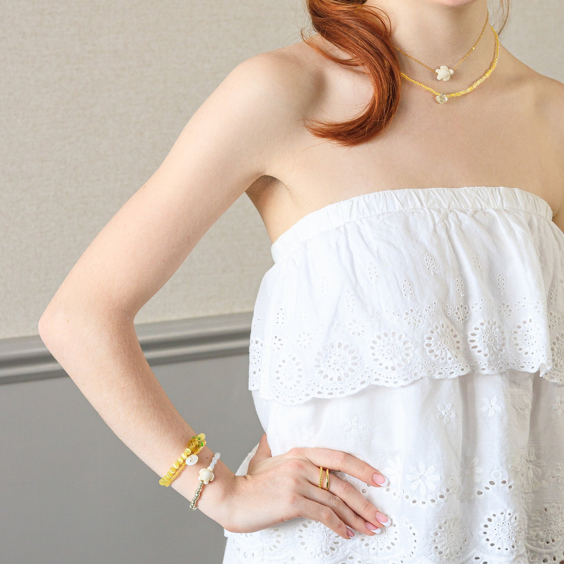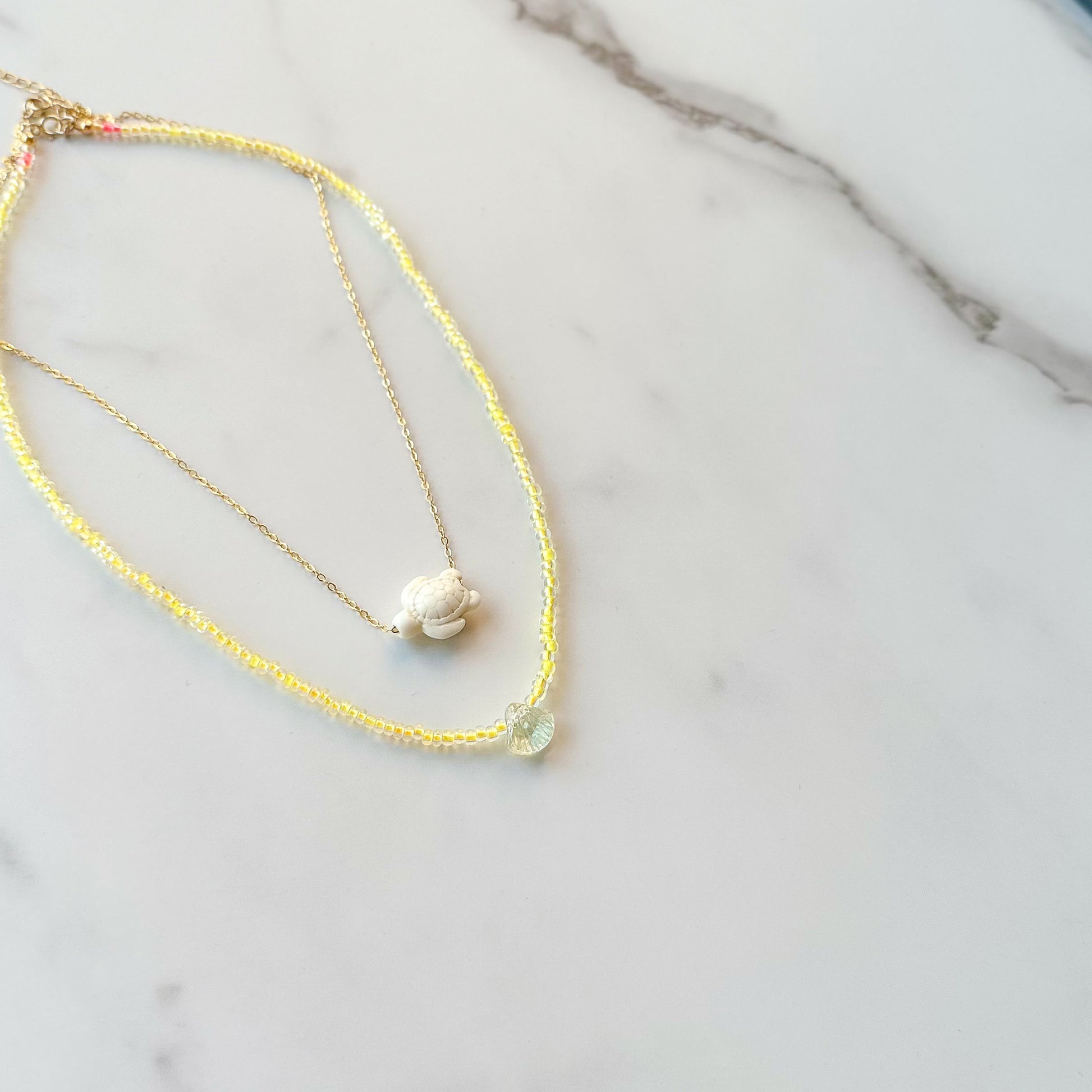 - A duo of gold-filled cable chain and glass seed beaded necklaces decorated with turtle and shell charms: