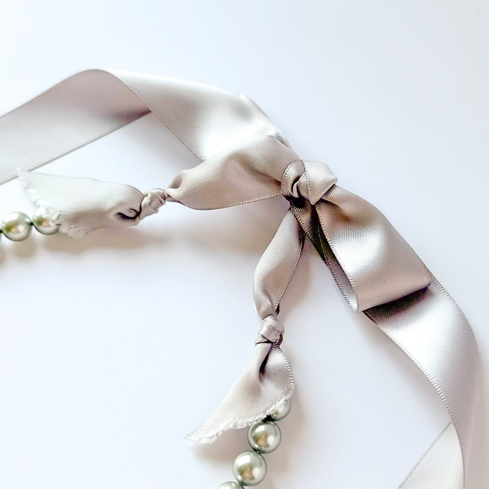 - Materials: Vintage Swarovski glass pearls, silver Miyuki glass seed beads, satin polyester ribbon, vintage beaded ball pendant, gold plated components