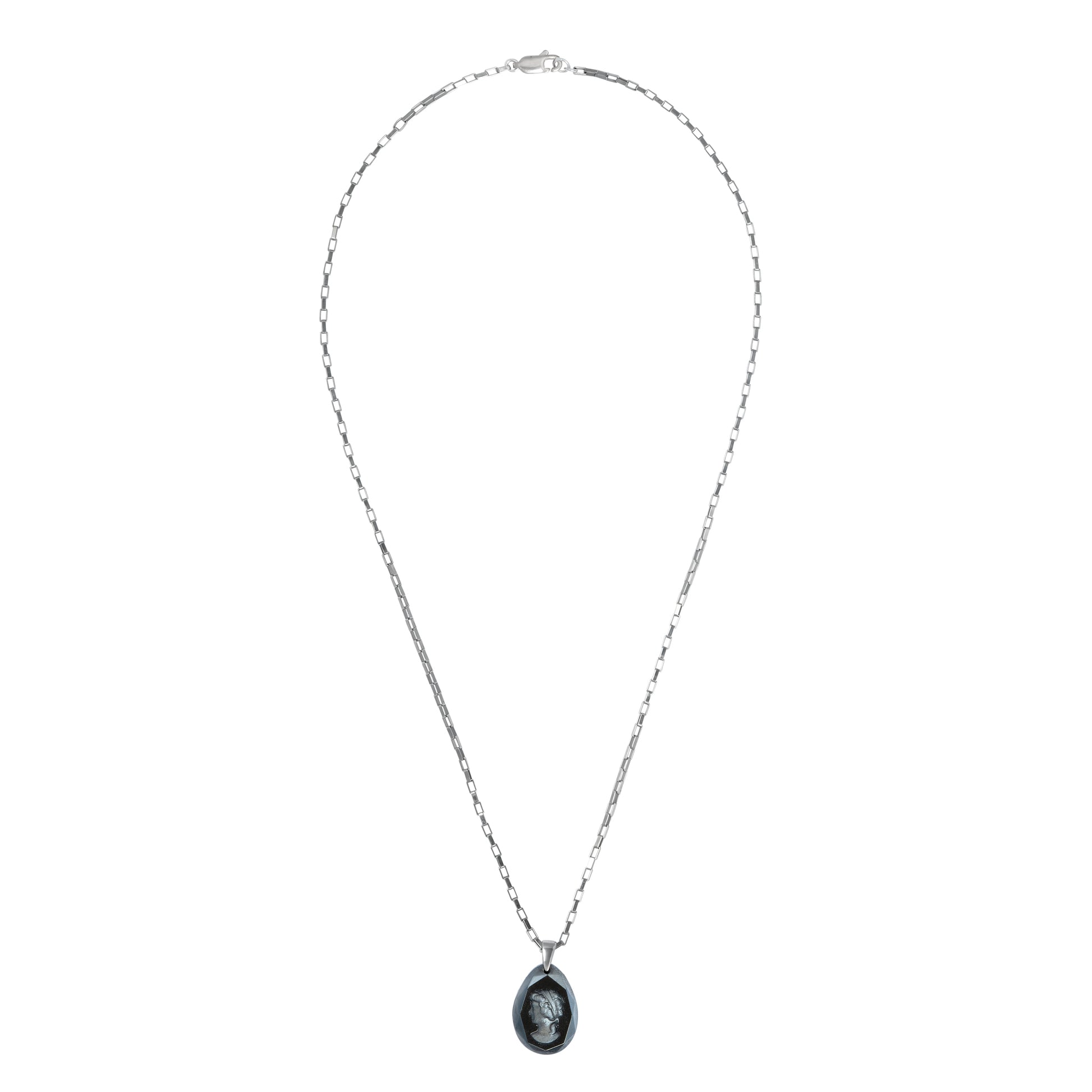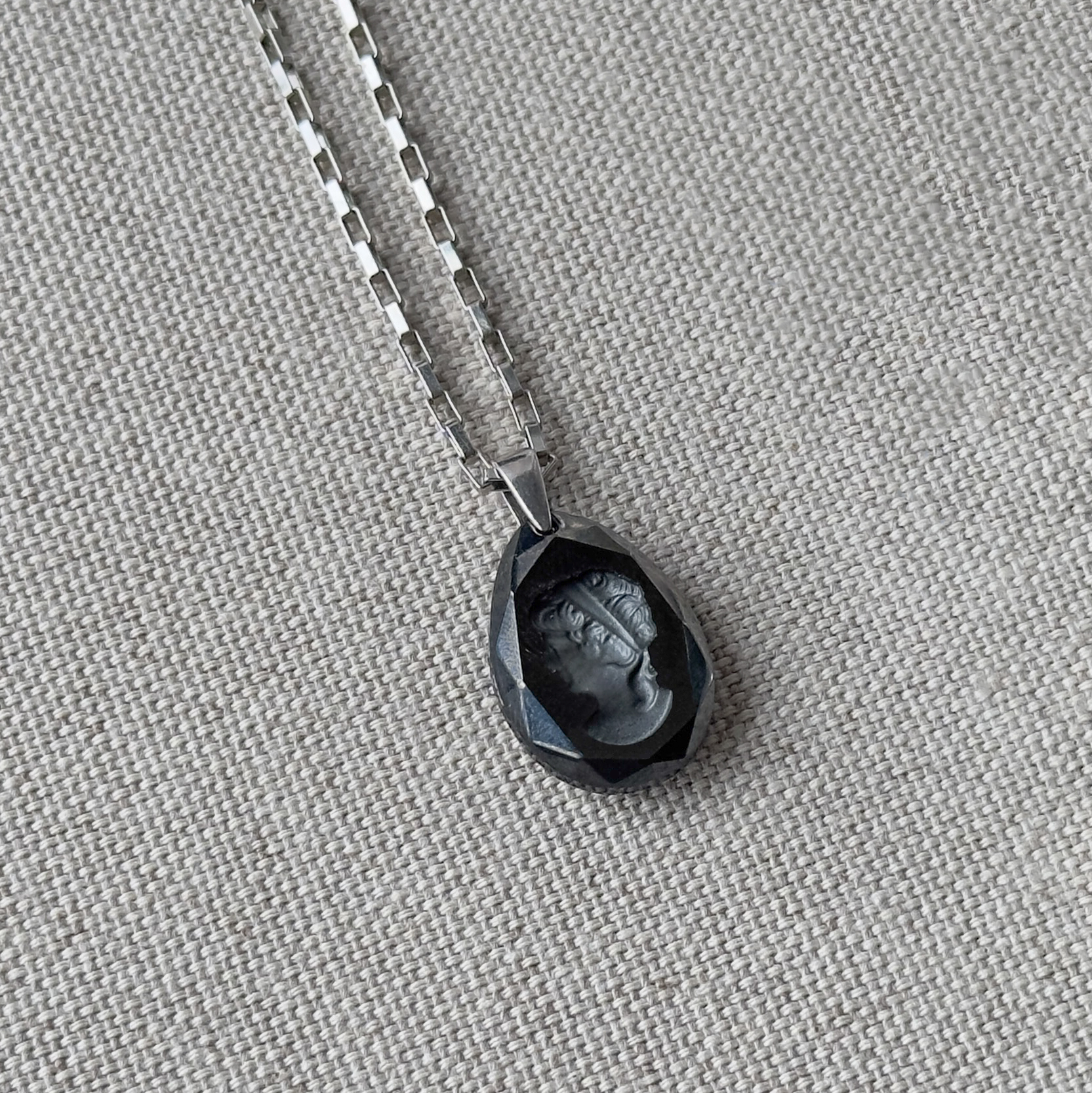 - Materials: Vintage German glass intaglio pendant, silver plated brass long box chain, sterling silver components