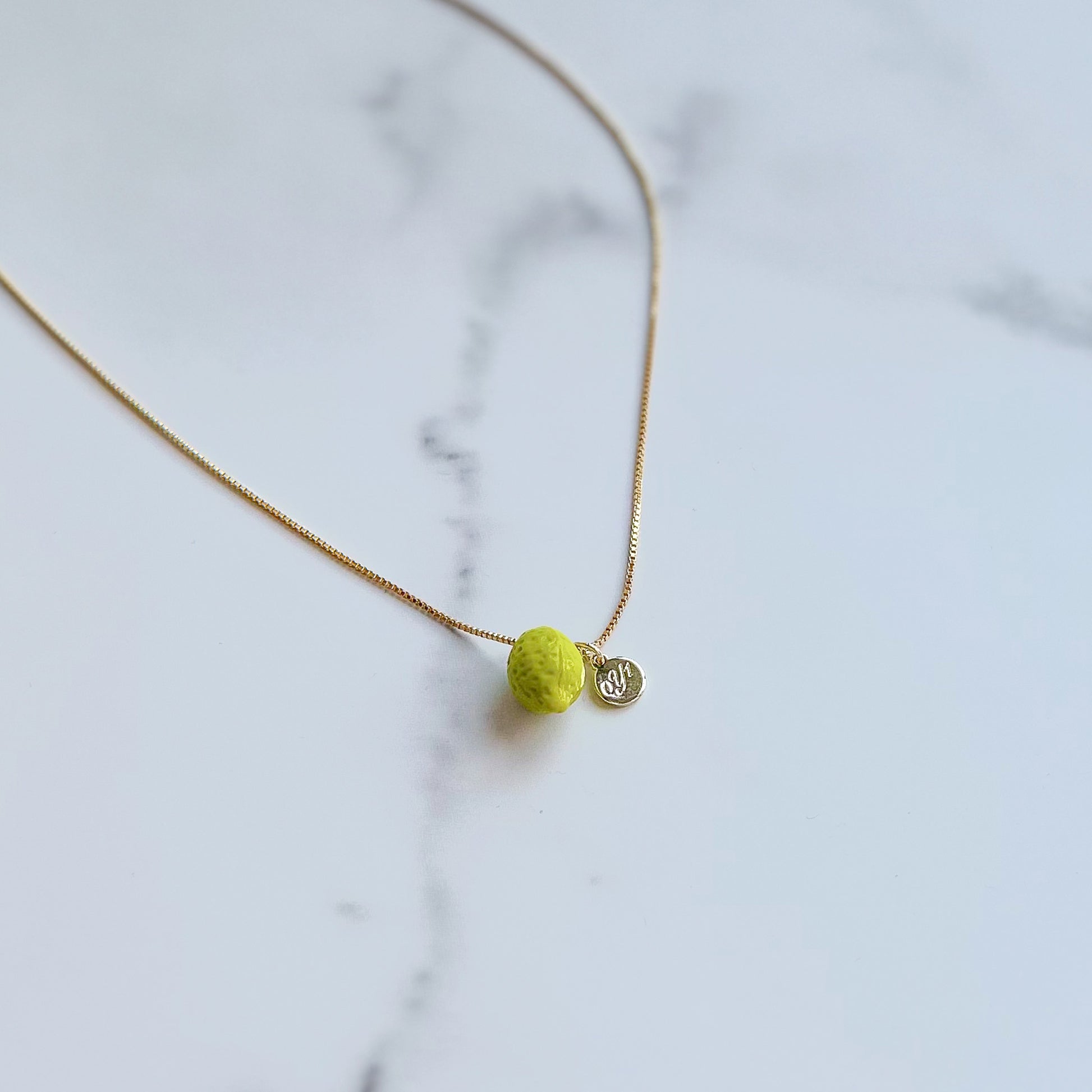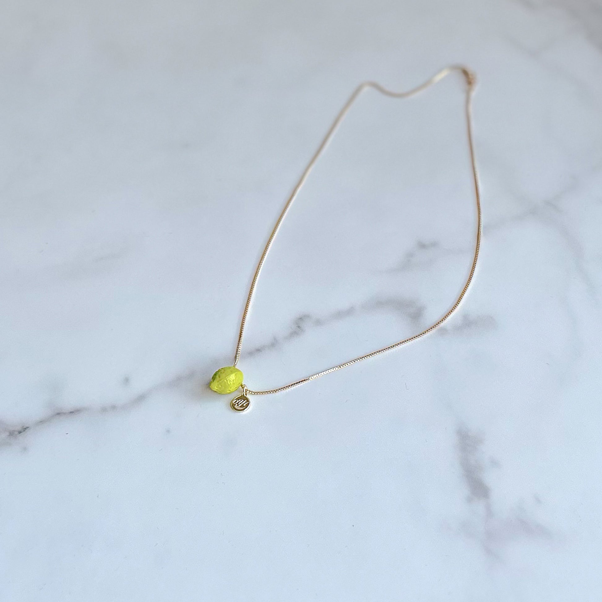 - Gold-filled box chain necklace with a glass citrus fruit charm and logo tag