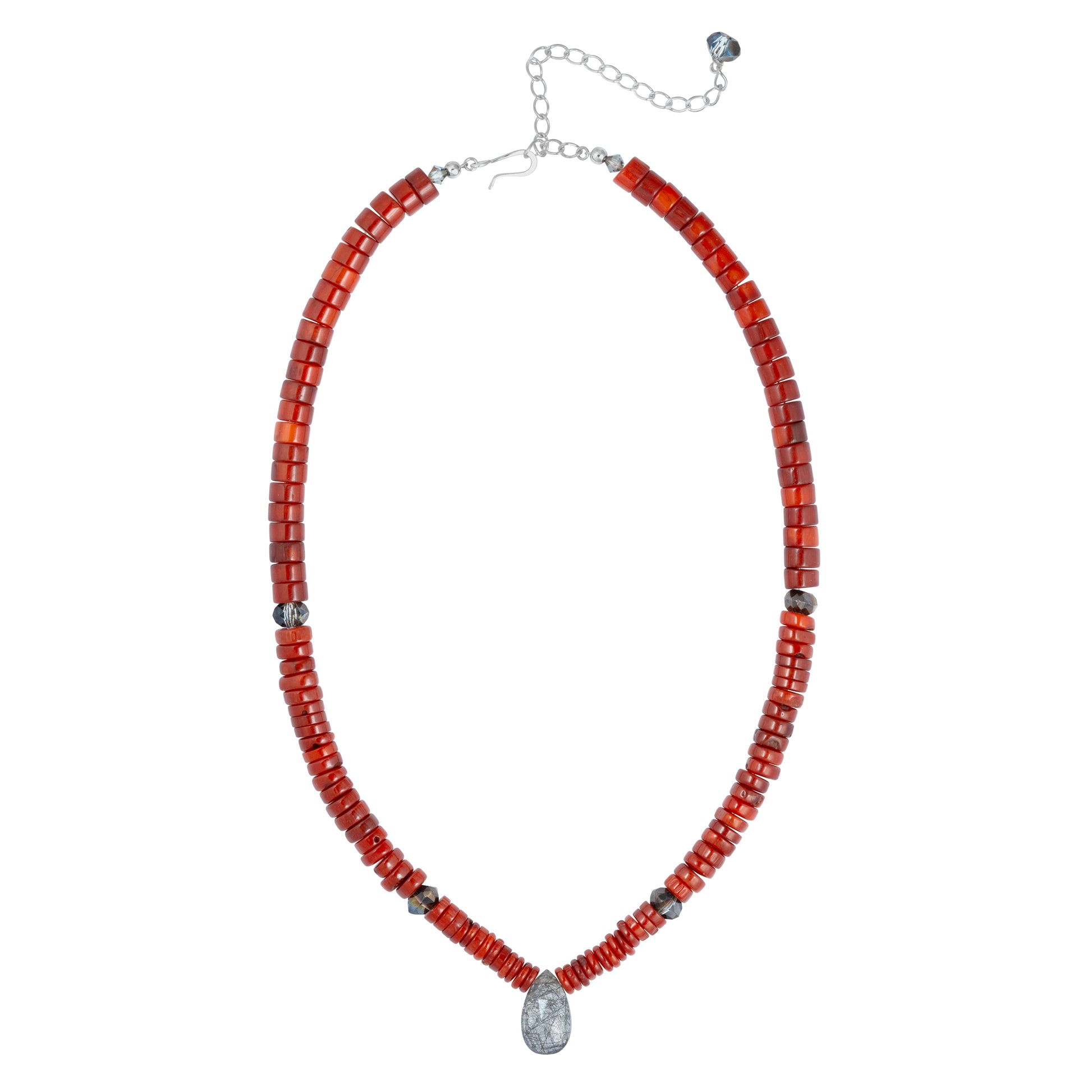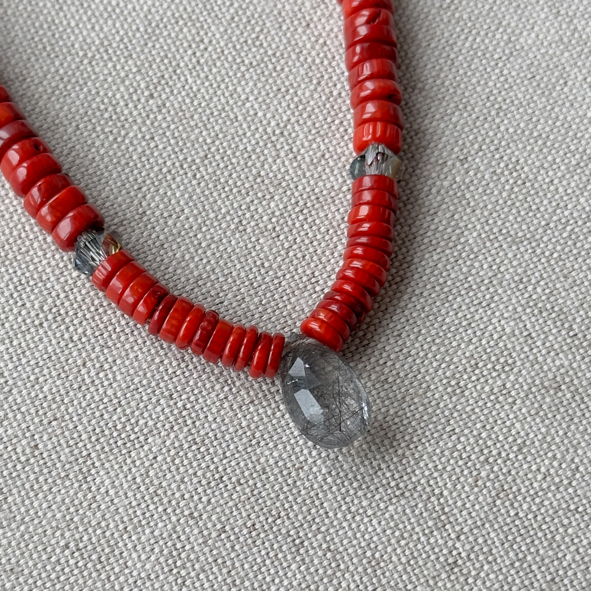 • Materials: Black rutilated quartz pendant, coral gemstones, crystal accents, Swarovski crystal beads, silver plated components