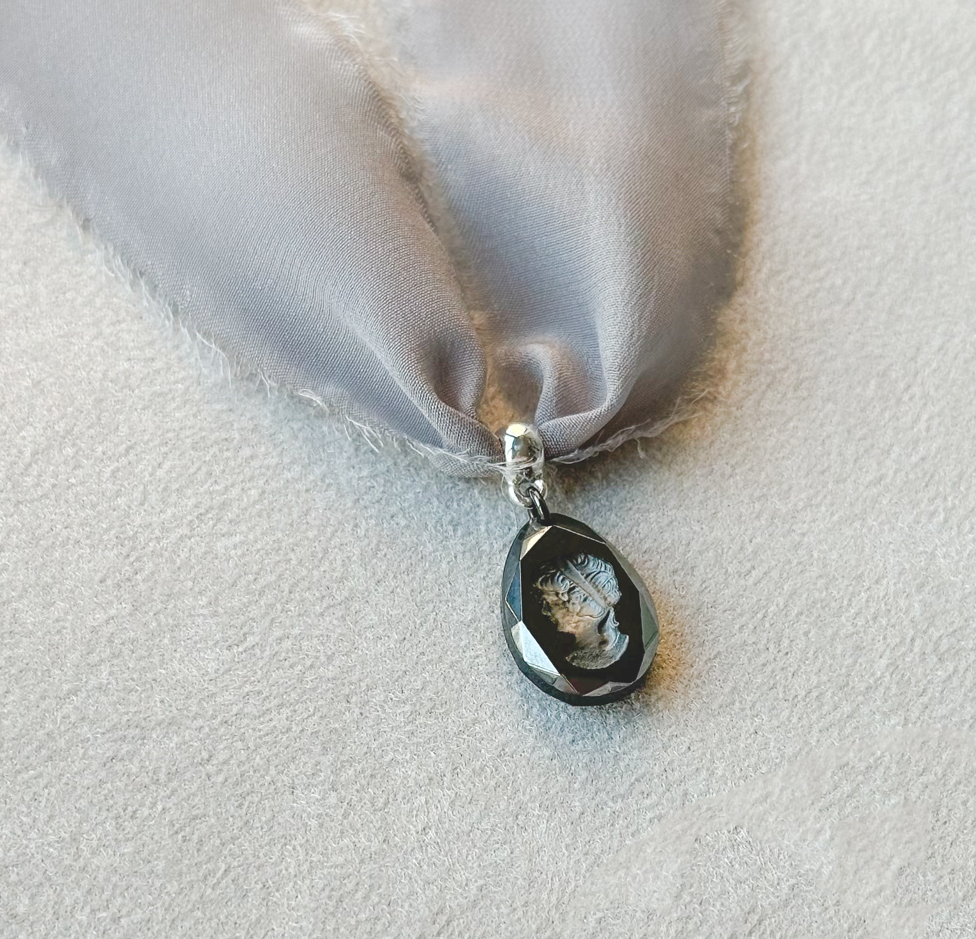 - Materials: Vintage German glass intaglio pendant, silver-gray crepe de chine silk ribbon with frayed edge, banded freshwater pearl end charm, sterling silver and silver plated components